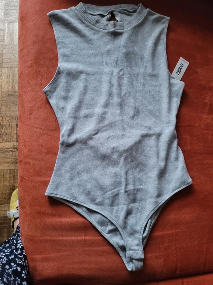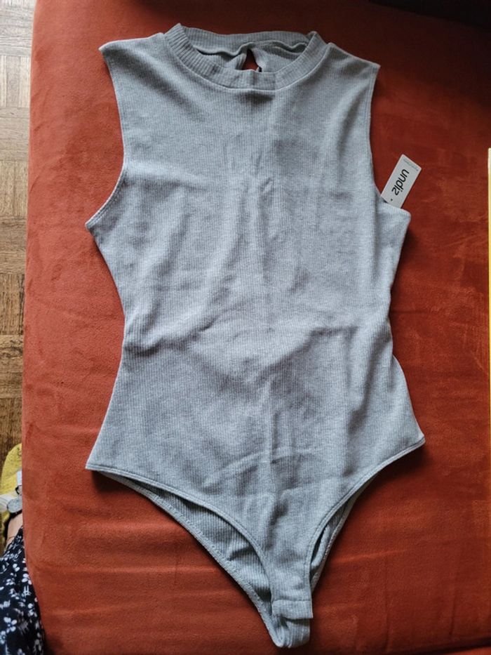Très joli bodie gris chiné. Le dos est ouvert XXXX Neuf, avec étiquette🏷 Classique devant, mais le dos en ouverture lassée fait tout son charme... Valeurs 19,95e, undiz. Envoi sous 24h_48h.