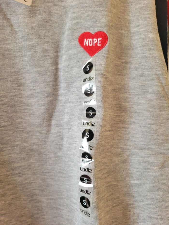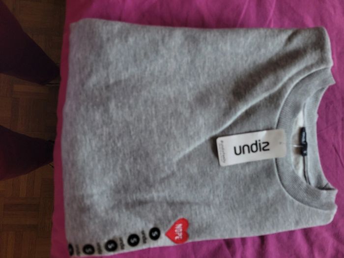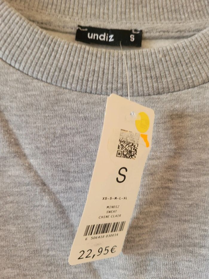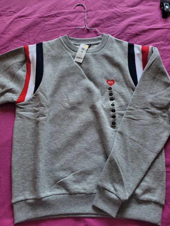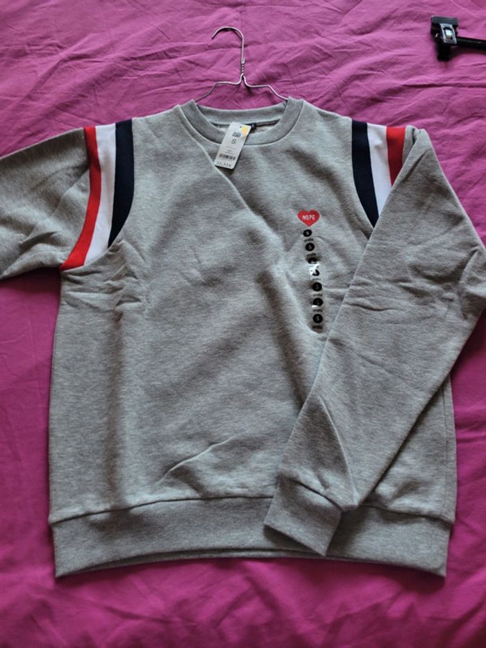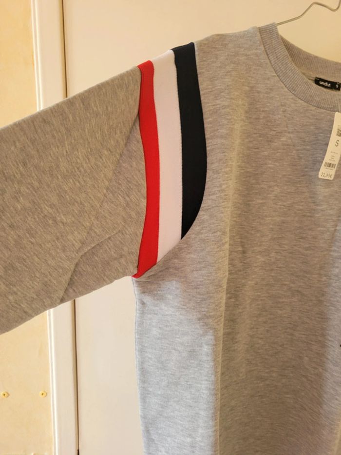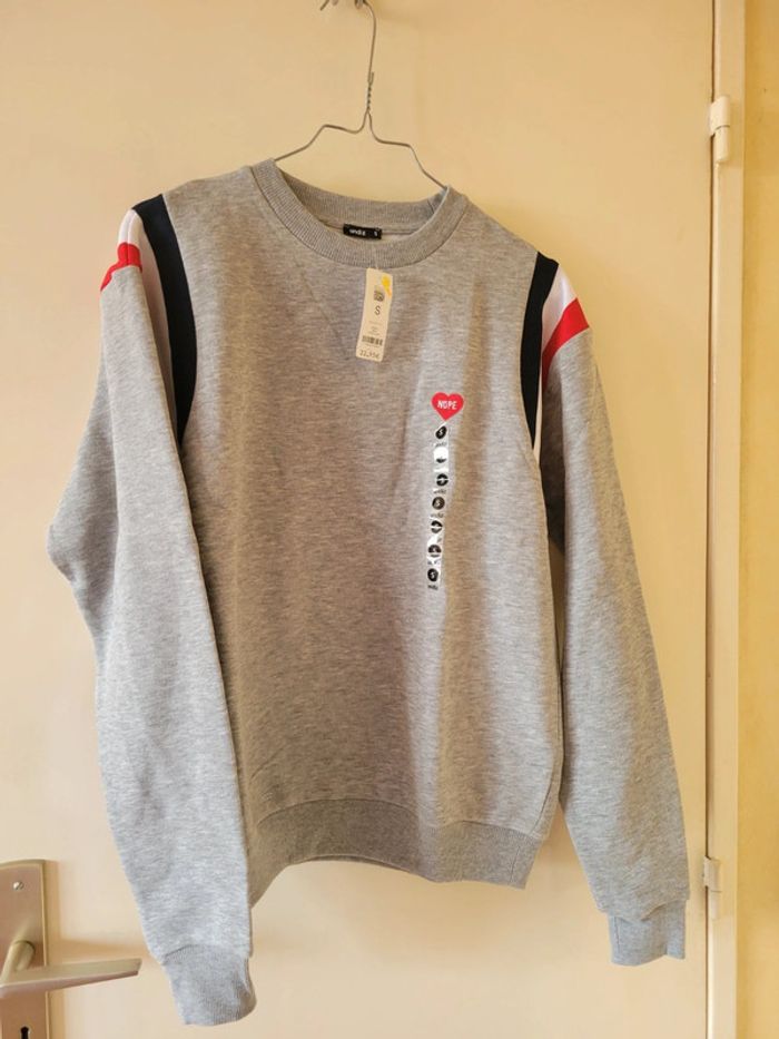Sweat gris, épaule bleu blanc rouge. Neuf avec étiquette 🏷 Taille S, ado u femme. Valeur 22,95e Envoi sous 24h_48h