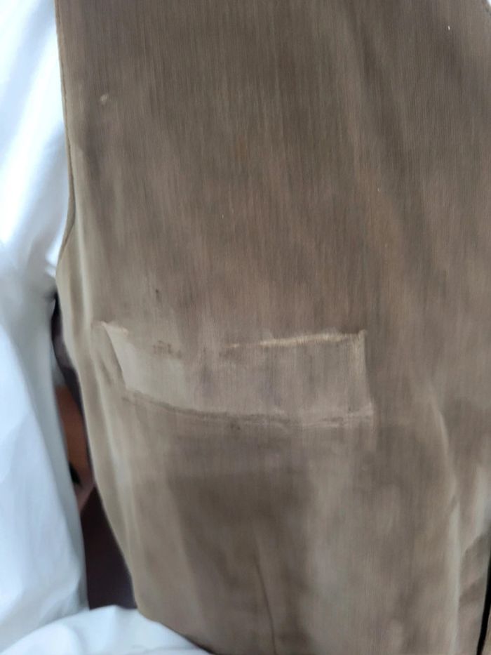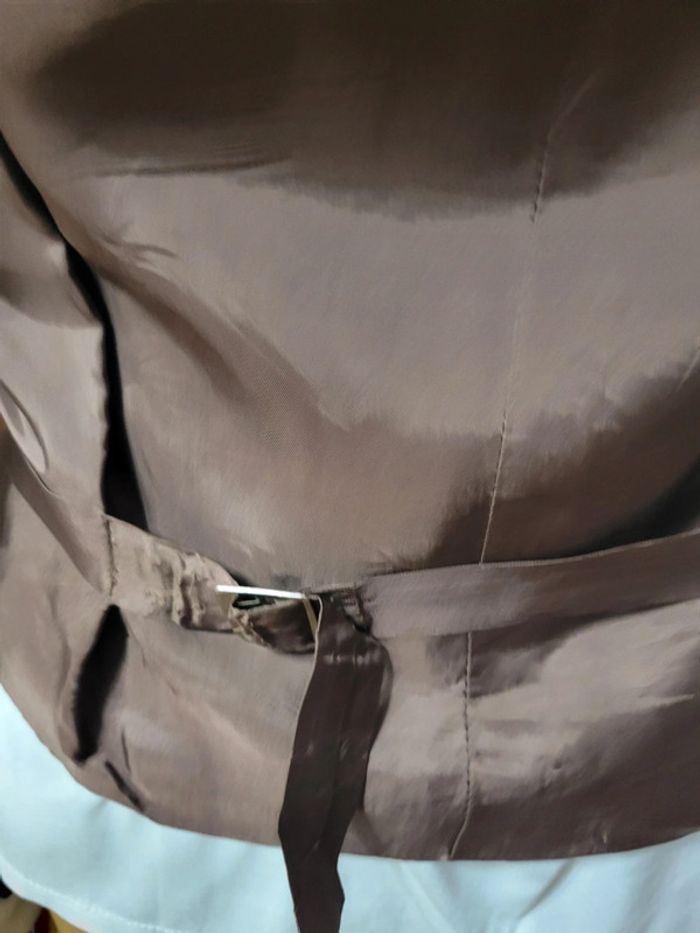 Touche daim. Marron A porté seul ou sur une chemise ( comme sur le mannequin). T38, t aille 40, possible de le resserrer derrière. Se porte cintré ou " cool" Les accessoires ( chemises, broche) sont disponibles à la vente dans mon dressing) Envoi sous 24h_48h
