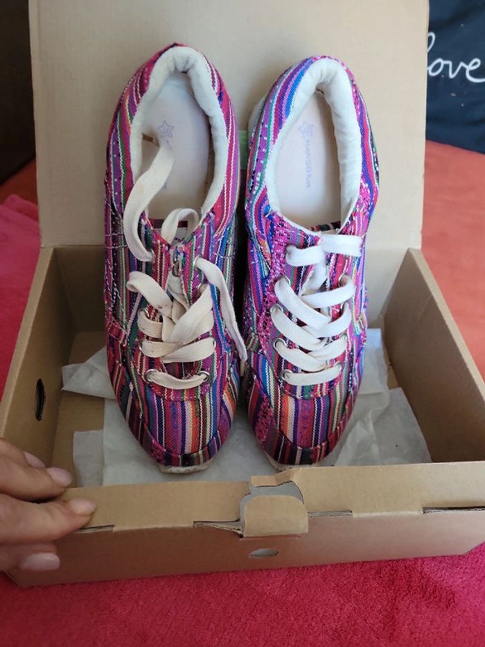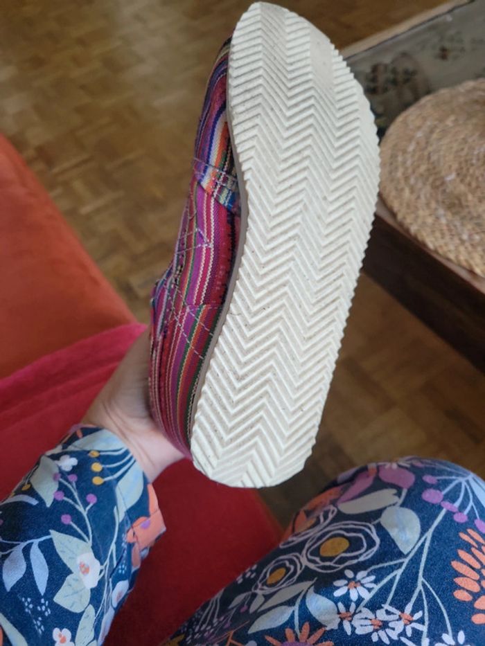 Taille 37. Achetées pour moi. Mais taille enfants....j ai le pied trop large....porte une fois en interieure.... Tissus multicolores. Envoi sous 24h/48h