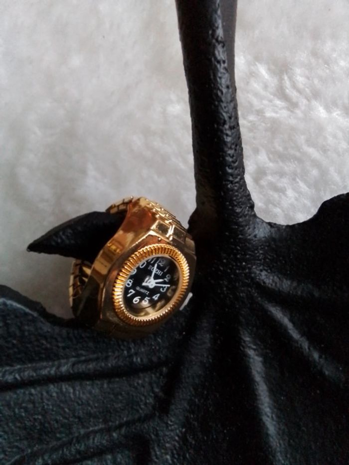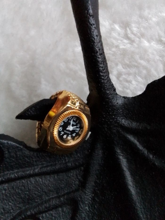 Bague montre dorée, fond noir Fonctionne comme une montre classique Bague montre et pile neuve Non waterproof Ajustable Différents modèles disponibles dans mon dressing Envoi rapide et soigné Pochette cadeau offerte sur demande