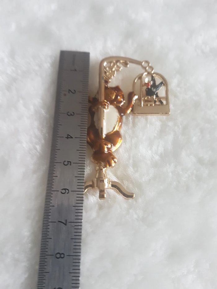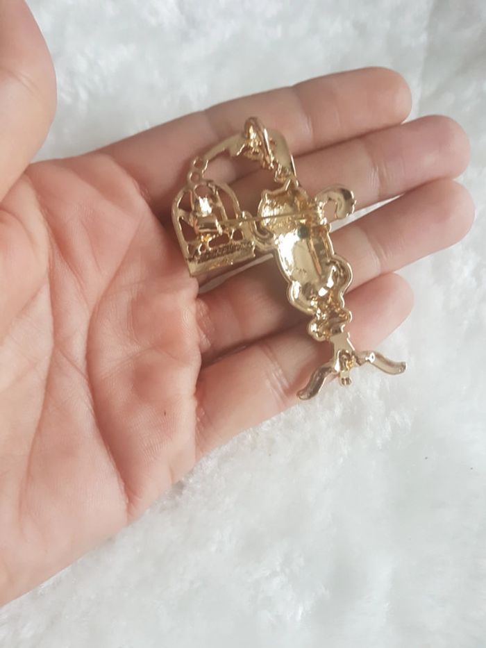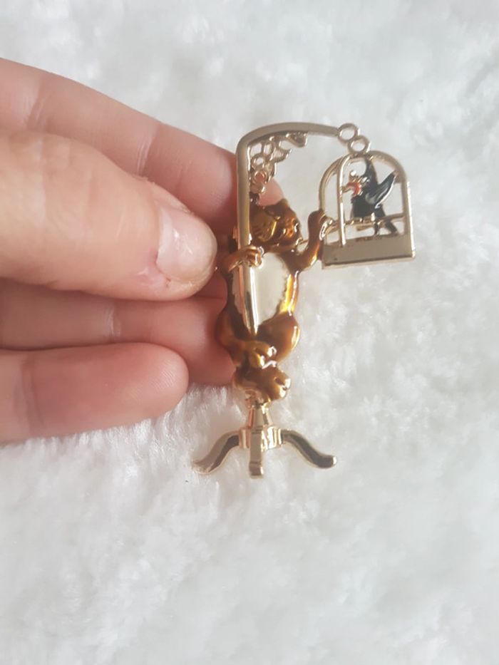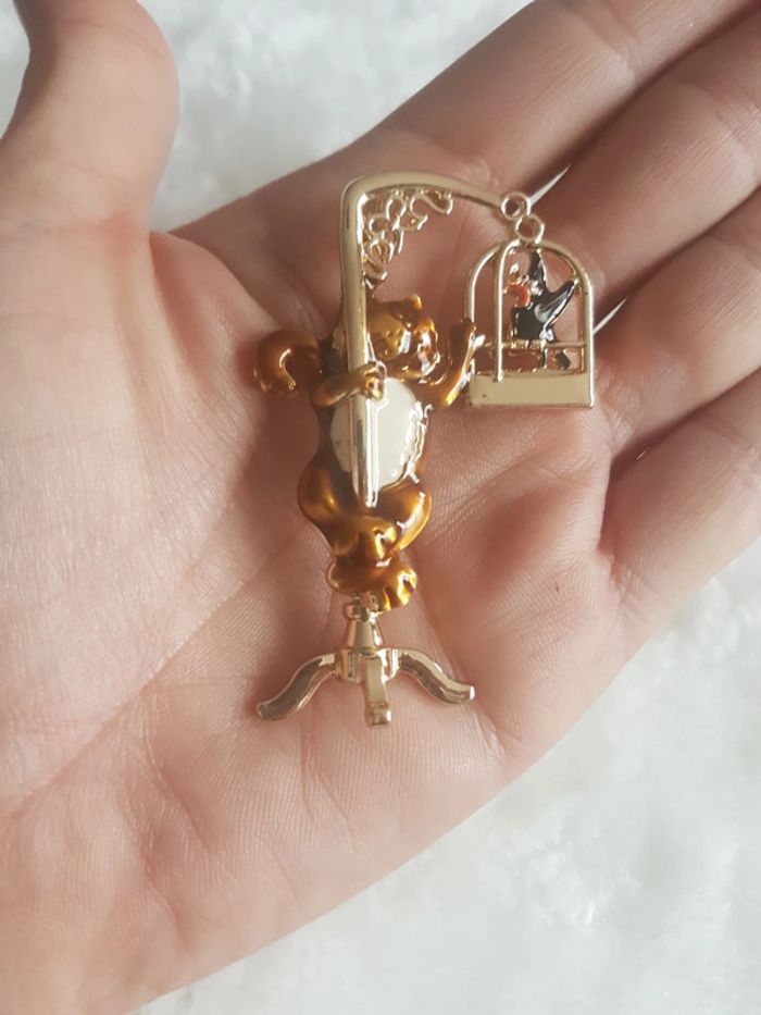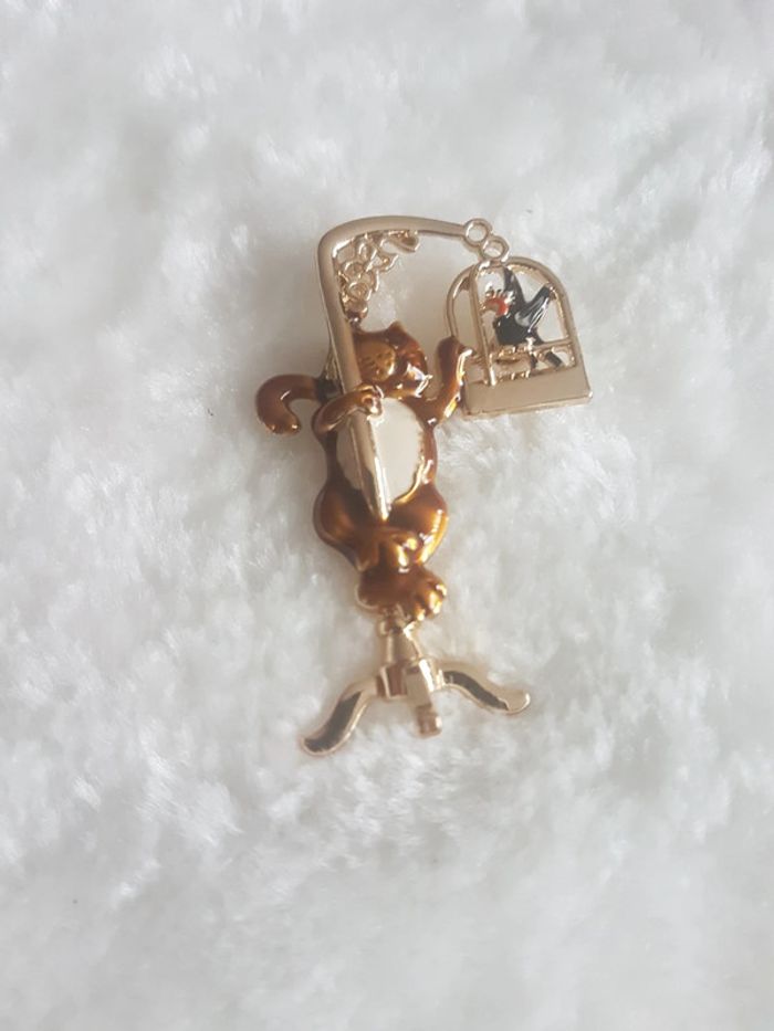 Très jolie et originale broche "le chat 🐾 sur sa balançoire" Neuve, jamais portée. Dorée. Envoi rapide et soigné. Pochette 🎁cadeau offerte sur demande.
