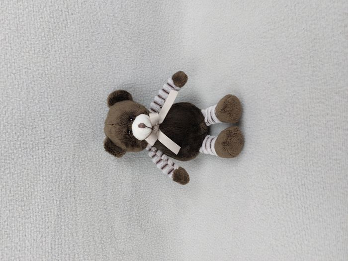 Petite peluche doudou ours RODA marron rayures gris chiné nœud beige 18 cm Très bon état, lavé avant la vente Envoi soigné et rapide Réf A11251