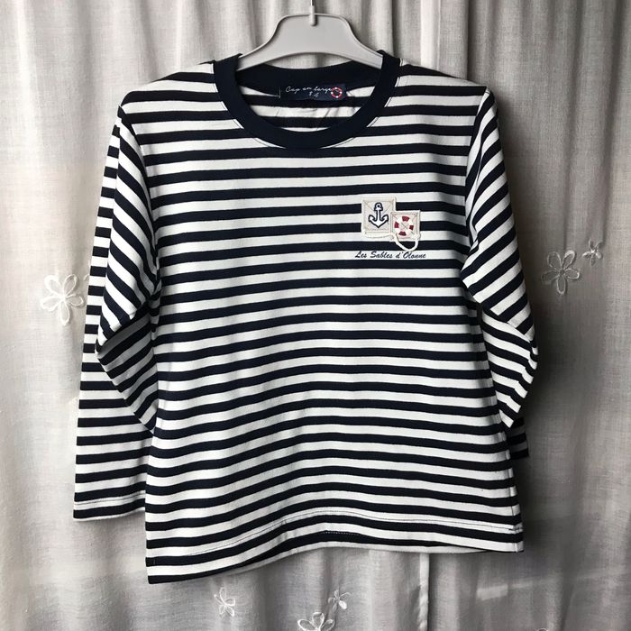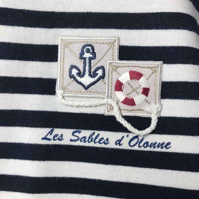 T-shirt marinière manches longues Rayé bleu marine et blanc Écussons poitrine ancre et bouée Les sables d’Olonne Taille 8 ans Cap au large