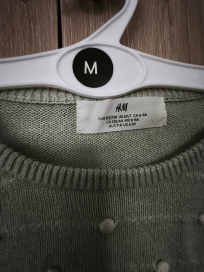 Pull enfant hiver Taille 6 a 8 ans - 122 / 124 cm Marque h&m Col rond manches longues. Coloris vert d'eau avec petit pompon blanc. Bord col manches bas côtelé Parfait état. Imperfection : 2 points de feutres devant ( visible photo) 100 % coton