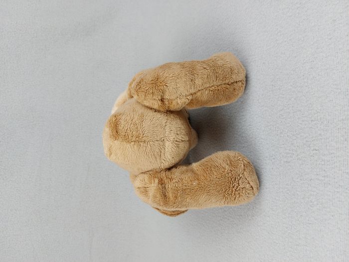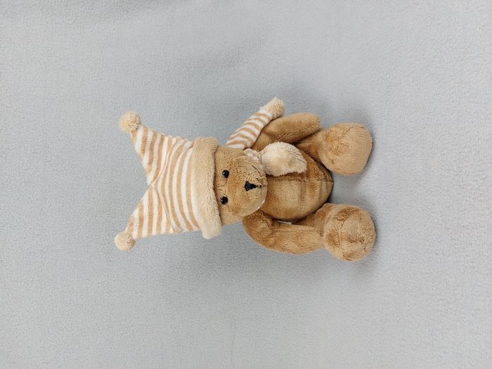 Peluche doudou ours marron bonnet rayé AFIBEL écharpe rayée beige écru billes pattes et fesses 24 cm assis Bon état, lavé avant la vente - réparation couture au dos, étiquette coupée Envoi soigné et rapide Réf A11220