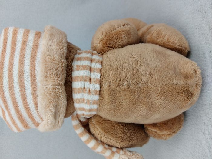 Peluche doudou ours marron bonnet rayé AFIBEL écharpe rayée beige écru billes - photo numéro 3