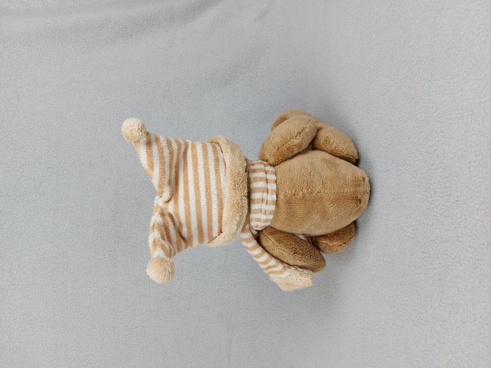 Peluche doudou ours marron bonnet rayé AFIBEL écharpe rayée beige écru billes - photo numéro 1