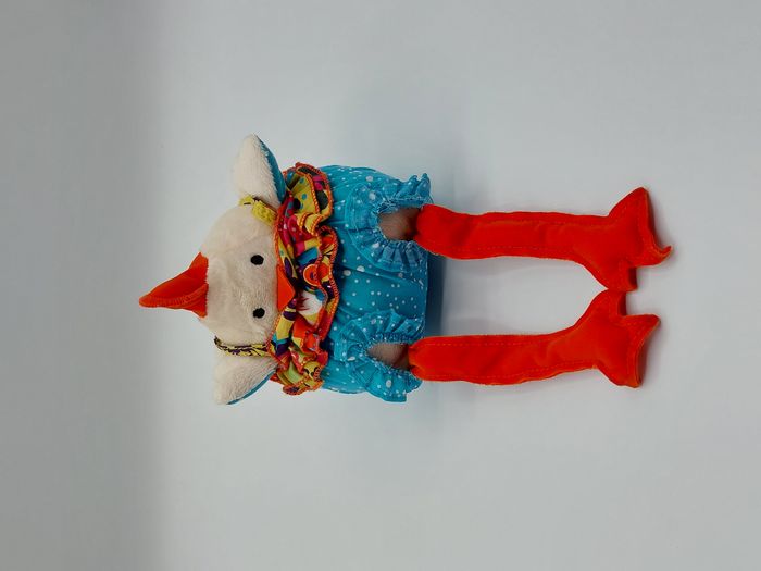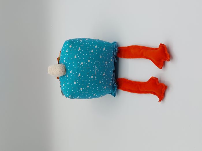 Peluche doudou poule coq CATIMINI écru orange bleu pois blanc 16 cm assis, billes dans les pattes Très bon état, lavé pour la vente, le tissu laisse apparaître quelques fils les pattes et la crête sont bien de couleur orange, la photo ressemble plus à du rouge. Je n'ai pas réussi à faire mieux :) Envoi soigné et rapide Réf A11334
