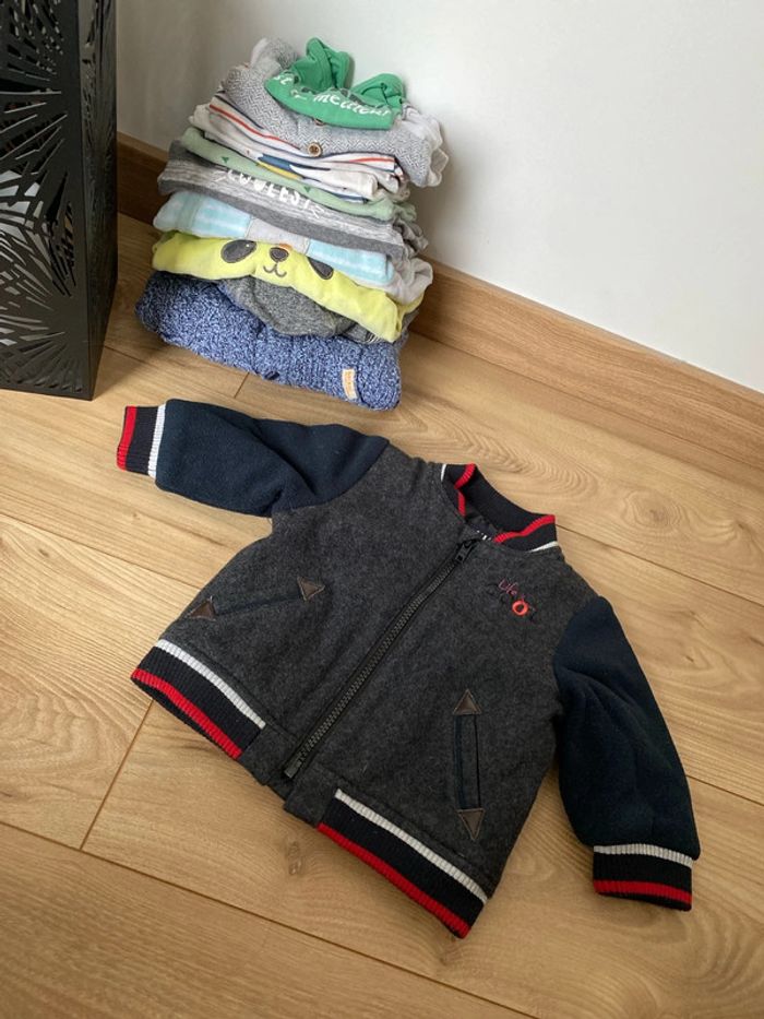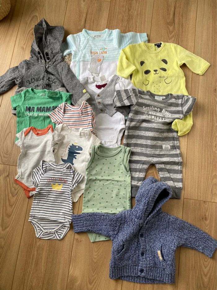 Lot comportant 1 gilet zippé, 1 gilet polaire, 1 t-shirt, 1 combinaison, 2 pyjamas velours, 5 bodys MC et 1 body ML.