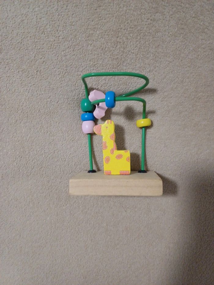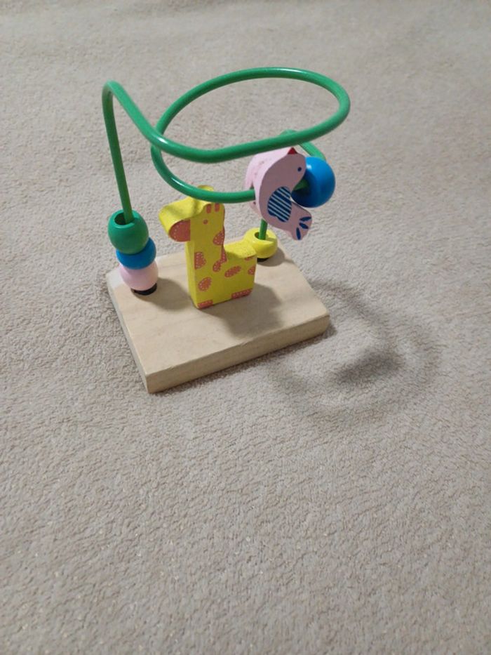 Jeux en bois ou on fais coulisser les forme sur le chemin vert.