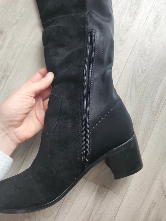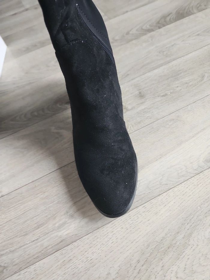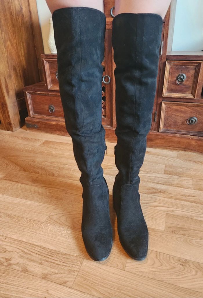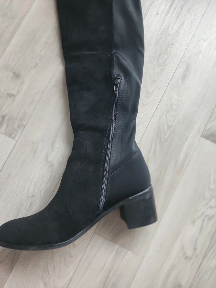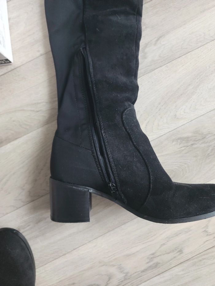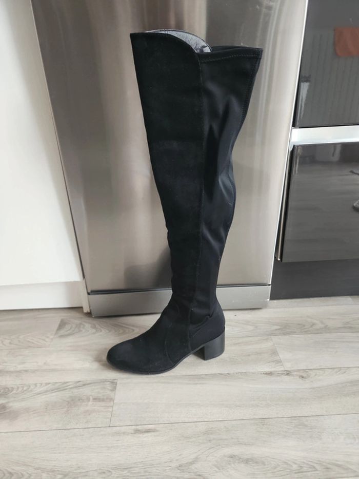 Portées 1 fois comme neuve Noires bi matiere aspect daim sur le dessus et tissu satiné à l'arrière Talon 6cm cf photo Hauteur botte cf photo Diamètre genoux cf photo Dautres articles ici #nadou8763_chauss