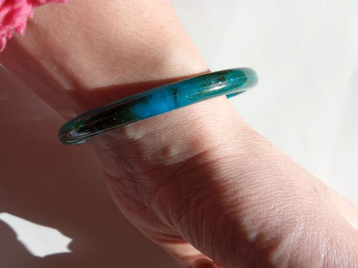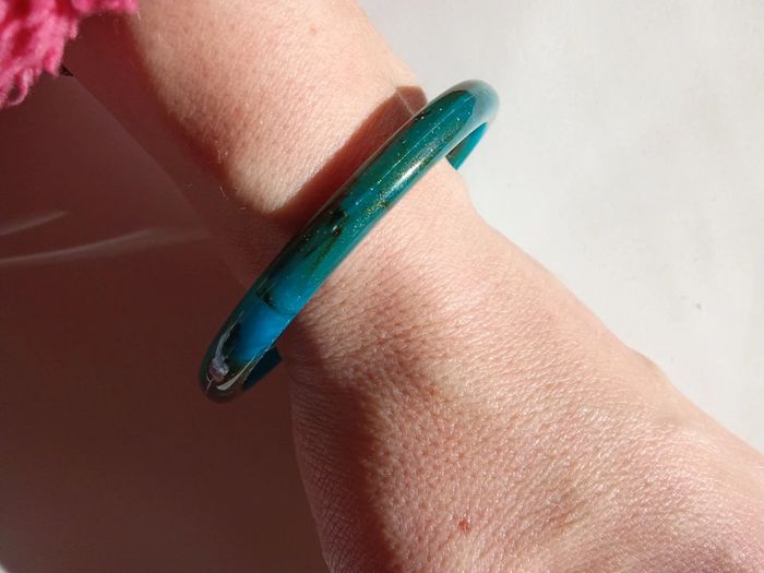Beau bracelet bleu vert Plastique je pense , avec un peu de brillant par endroit #vintage #bracelet #wristband #pulsera #bleu #canard #vert #plastique #dur #rond #oldies #chic #elegant #woman #teen #ado #femme #mujer #dafnezfemme #dafnezado #dafnezbijou