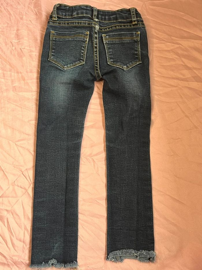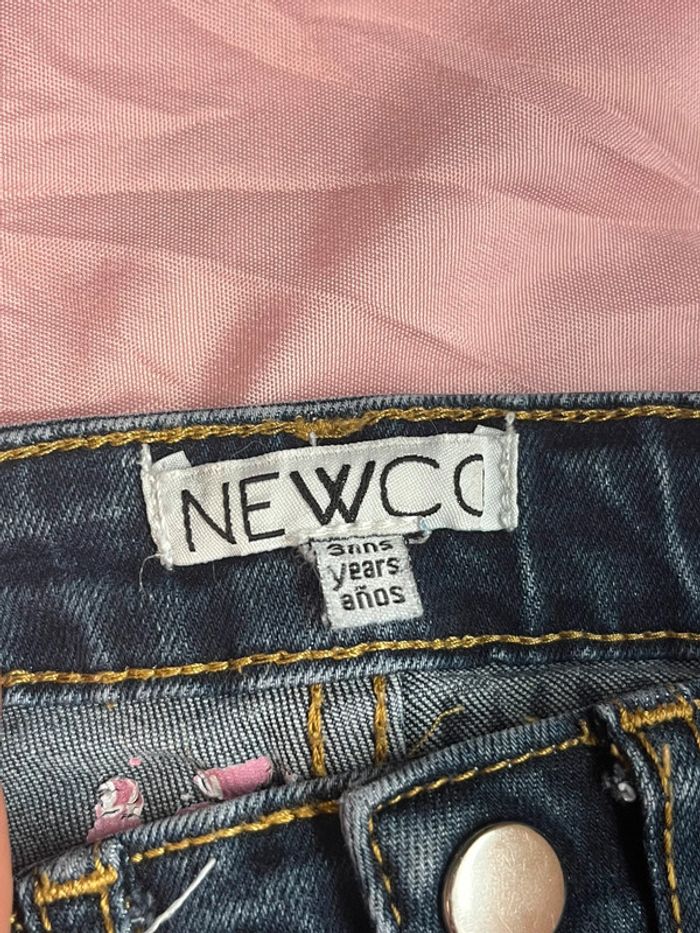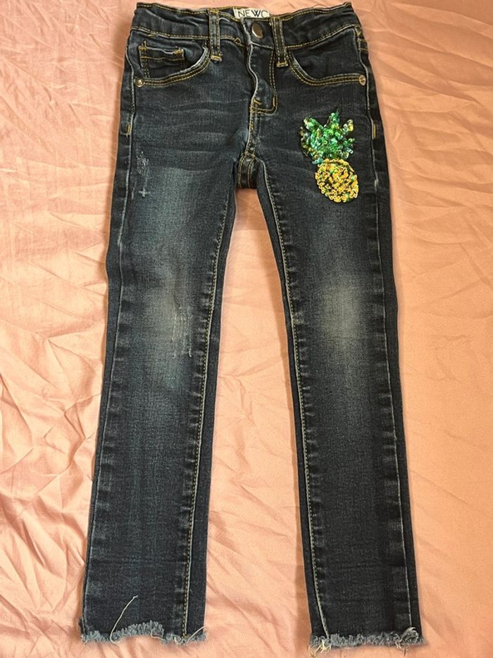 Jean's avec un effet effiloché sur le bas des jambes en parfait état. Motif ananas en sequins. Marque: Newco Taille: 3 ans C.E
