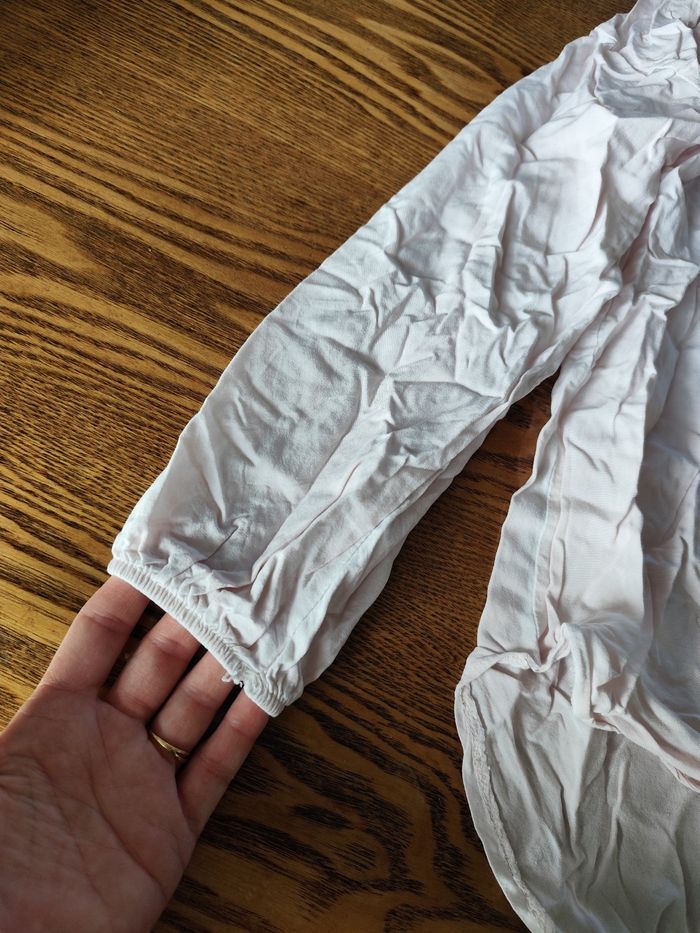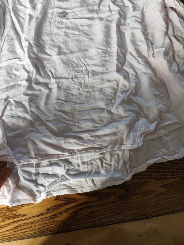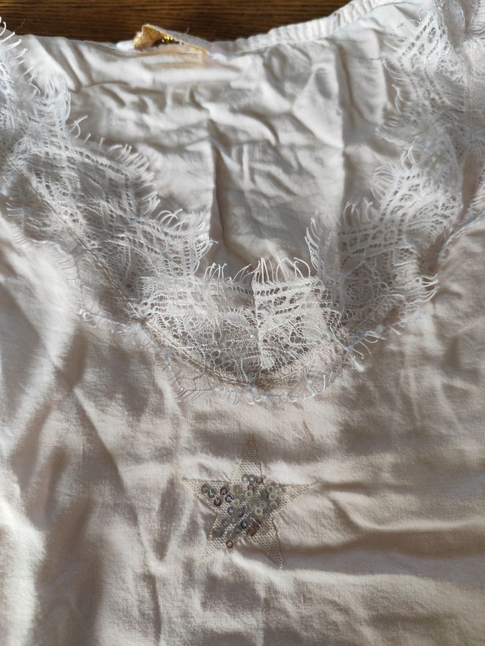 Blouse en très bon état. Plus longue a l'arrière. Rose très pâle. Dentelle au niveau du col a l'avant. Et étoiles en sequins dessous