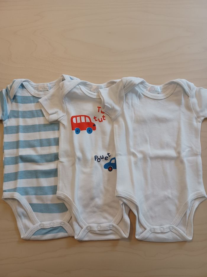 Lot de 3 bodys manches courtes: 1 rayé bleu et blanc 1 tout blanc 1 blanc avec motifs voitures