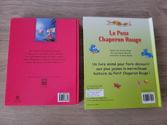 Vend lot de 2 livres en bon état juste des signes d'usures liés à la manipulation (voir photos). Lot comprenant un livre Les plus belles histoires de grand-mère des éditions Hemma et un livre animé du Petit chaperon rouge. Vendu tel que sur la publication.
