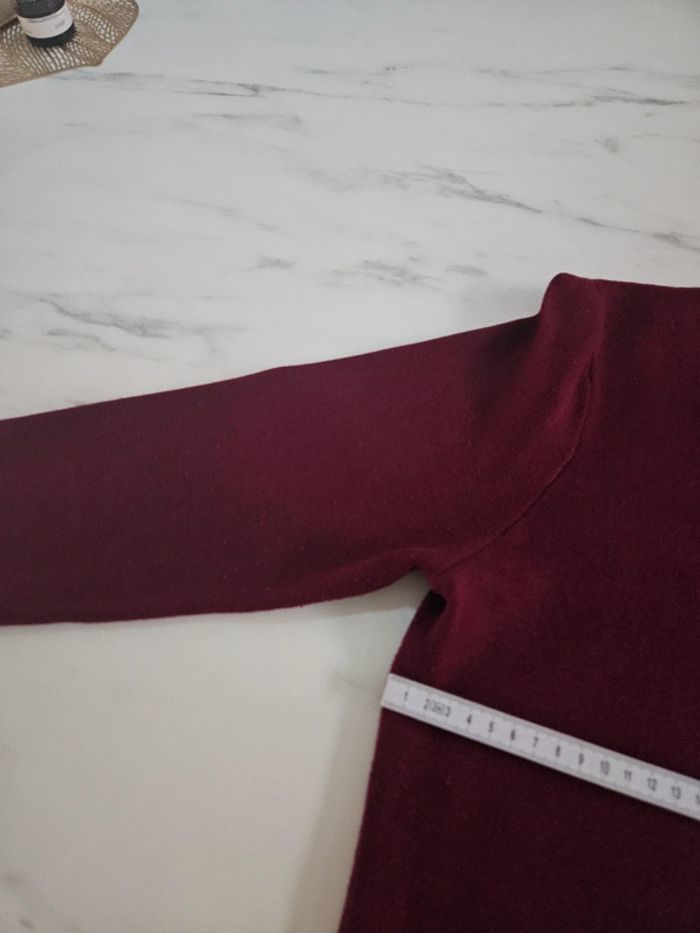 Pull col bijou. La matière est légèrement extensible. Bordeaux plus foncé comme la photo ou se trouve l'étiquette. Peu porté il est en très bon état et les dimensions se trouvent sur les photos