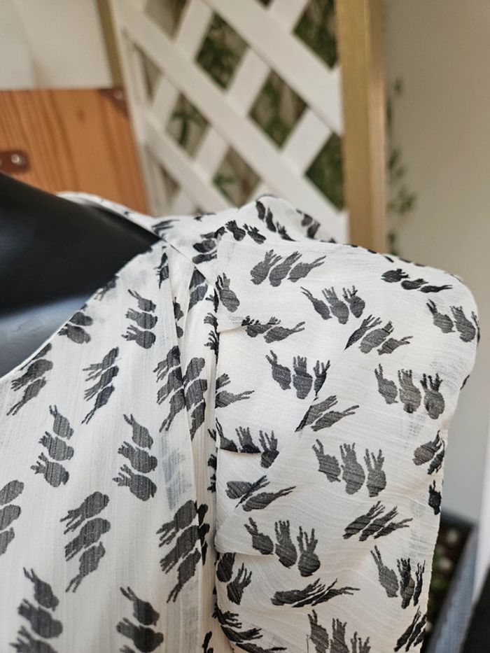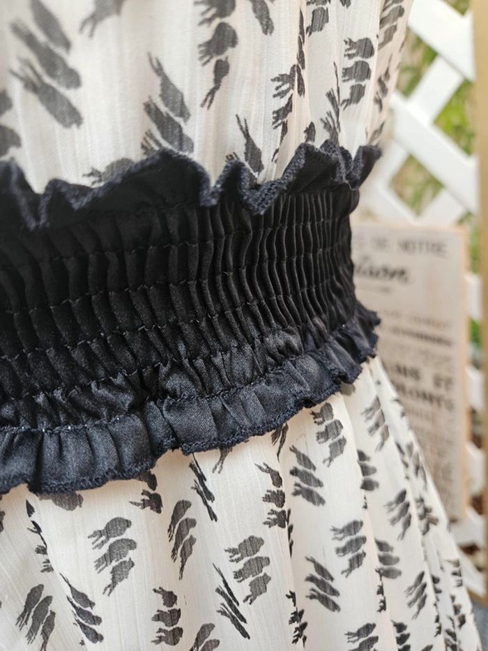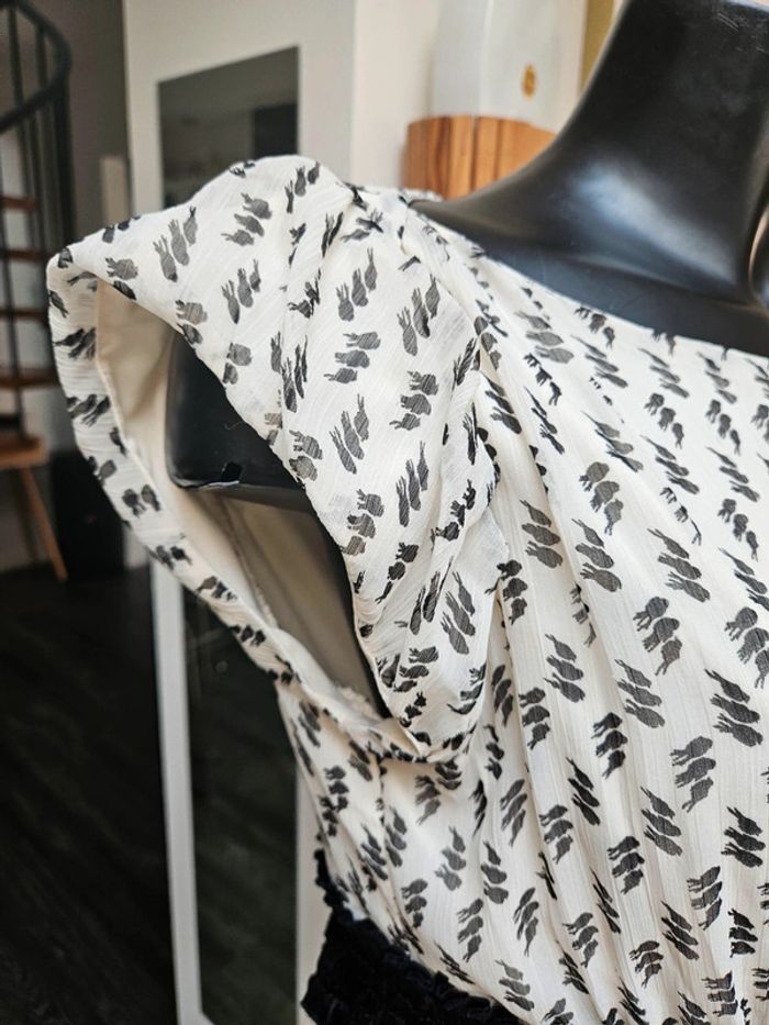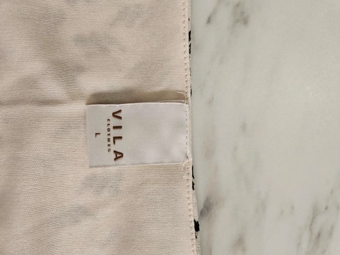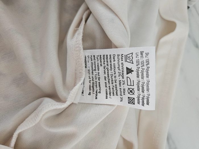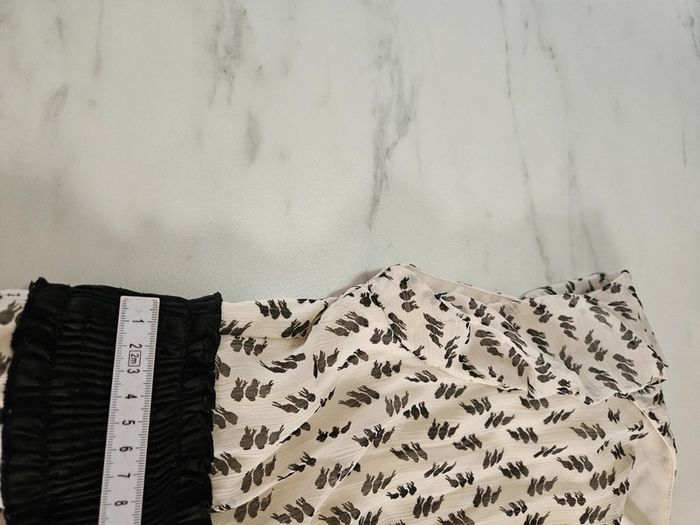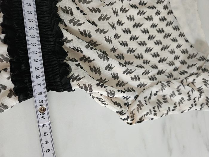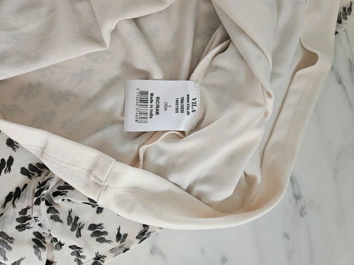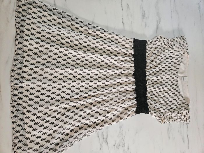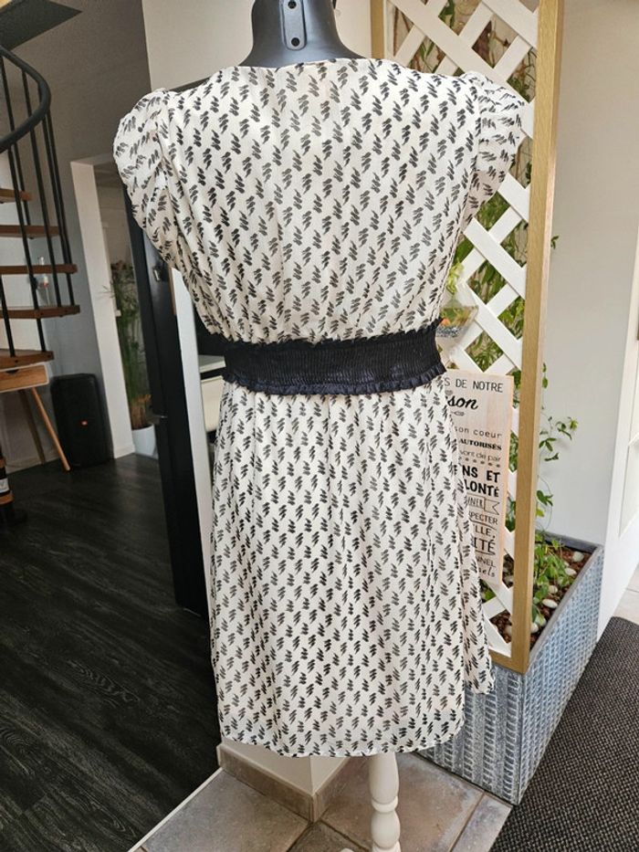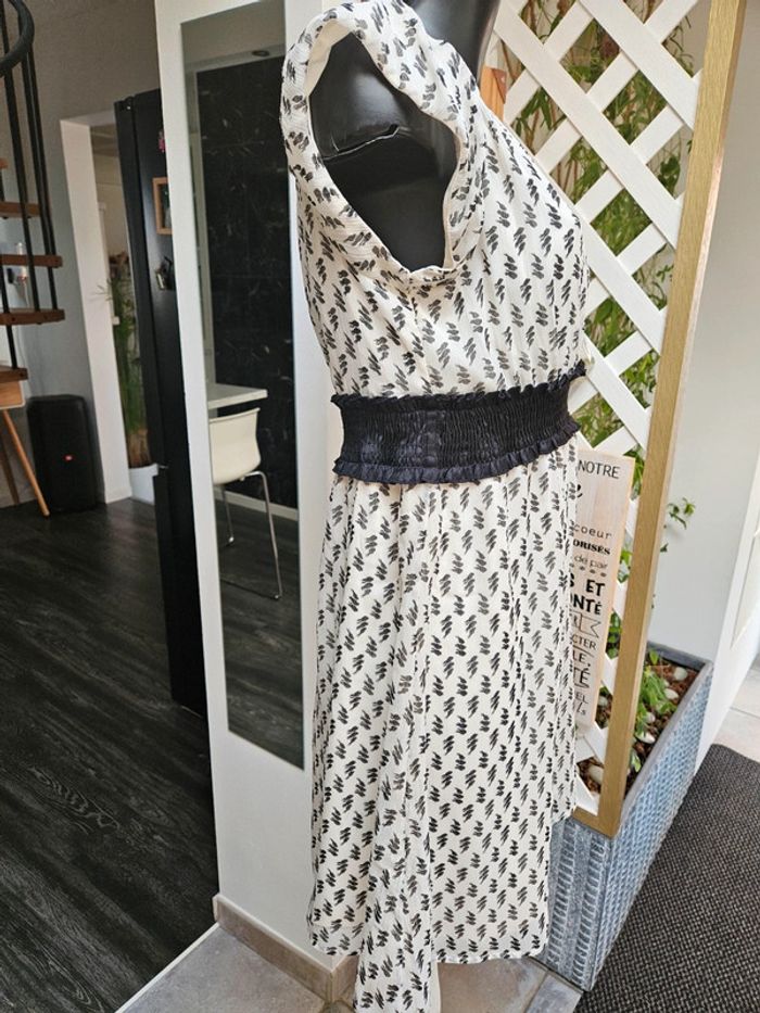 Robe légère beige motifs noirs. La ceinture est élastique. Portée mais reste en très bon état. Dimensions sur les photos