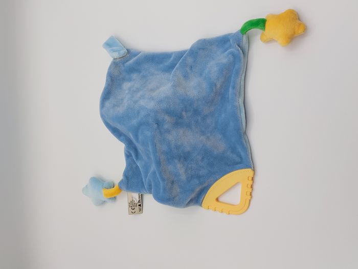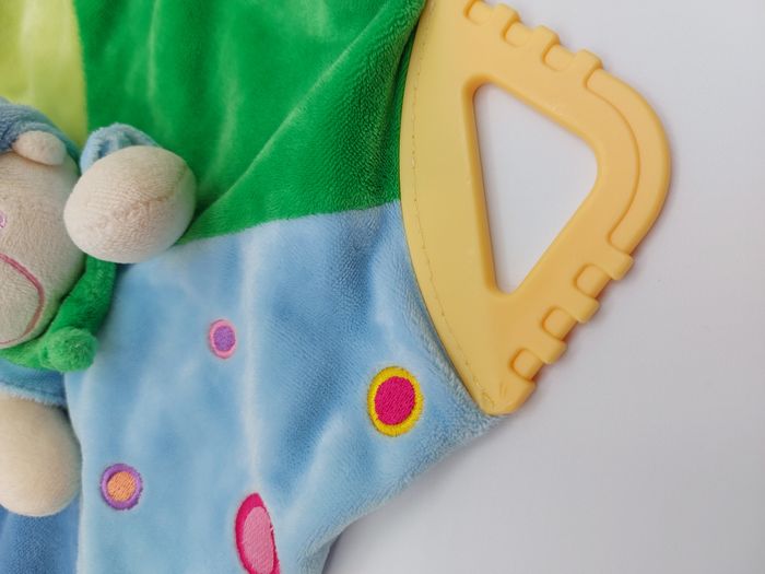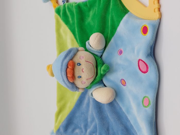 Doudou plat lutin garçon MOTS D’ENFANTS bleu vert jaune rond rose anneau TBE - photo numéro 4