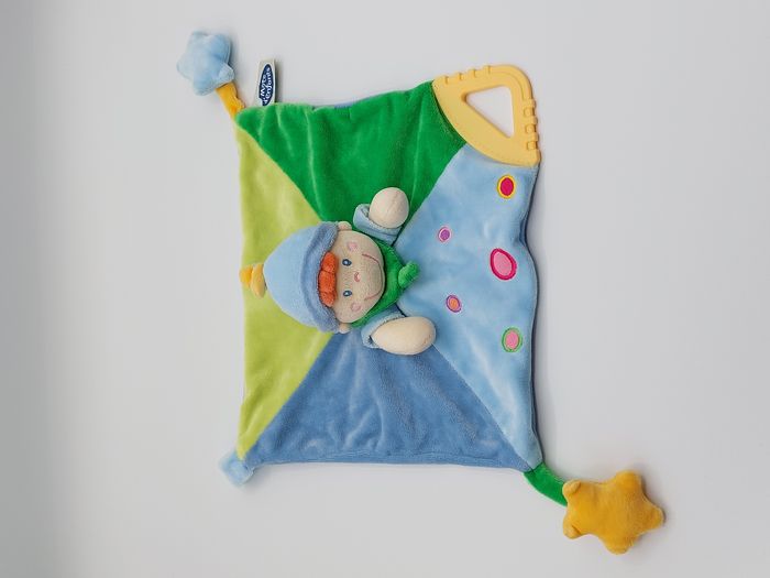 Doudou plat lutin garçon MOTS D’ENFANTS bleu vert jaune rond rose anneau TBE - photo numéro 1