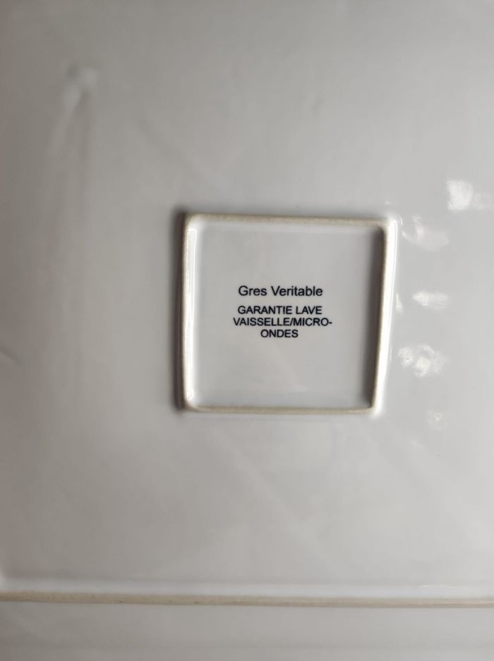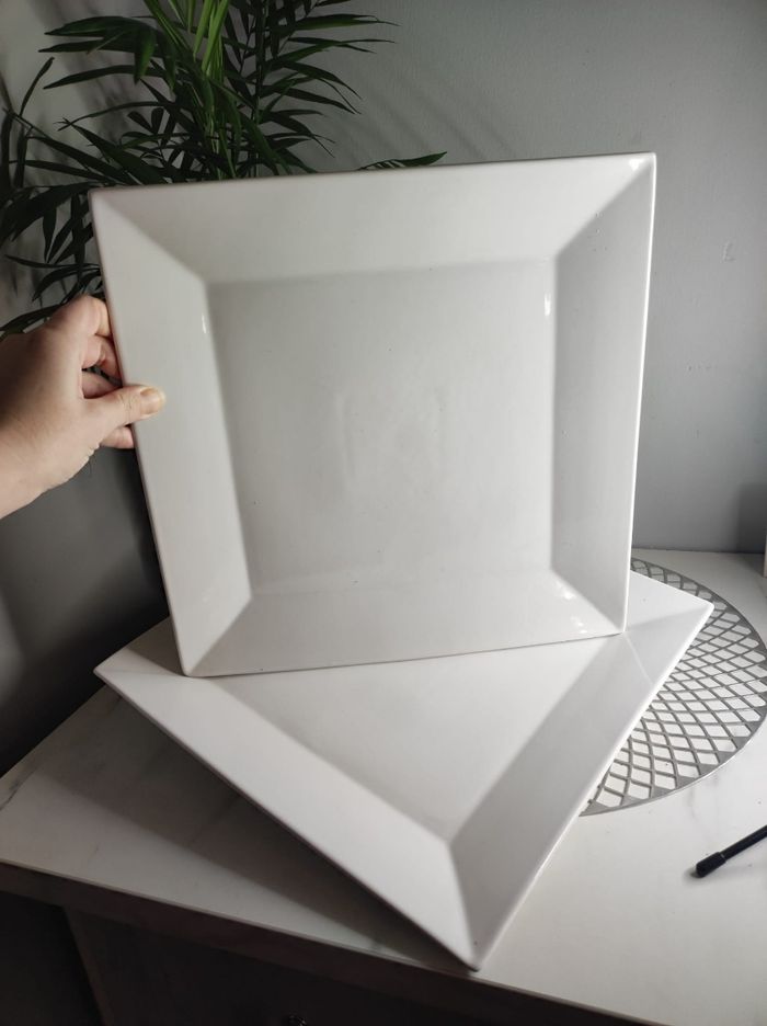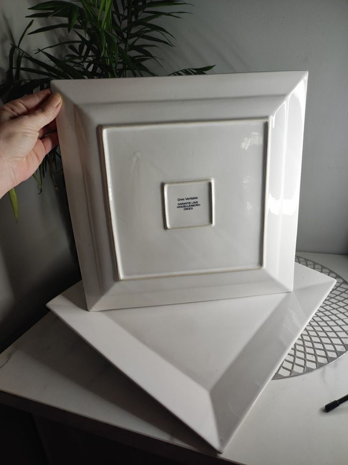 Deux très grandes assiettes carrées blanches en grès véritable. Compatible avec micro ondes et lave vaisselle. Dimensions 31x31 Pèsent leurs poids.