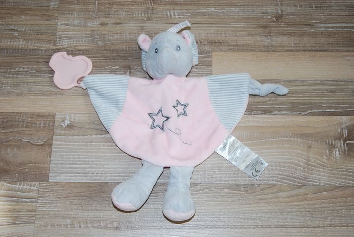 doudou elephant rose et gris etoiles brodées dessus, anneau de dentition hauteur 26 cm faisait parti d'une collection de plus de 200 doudous jamais câliné ni toutouillé