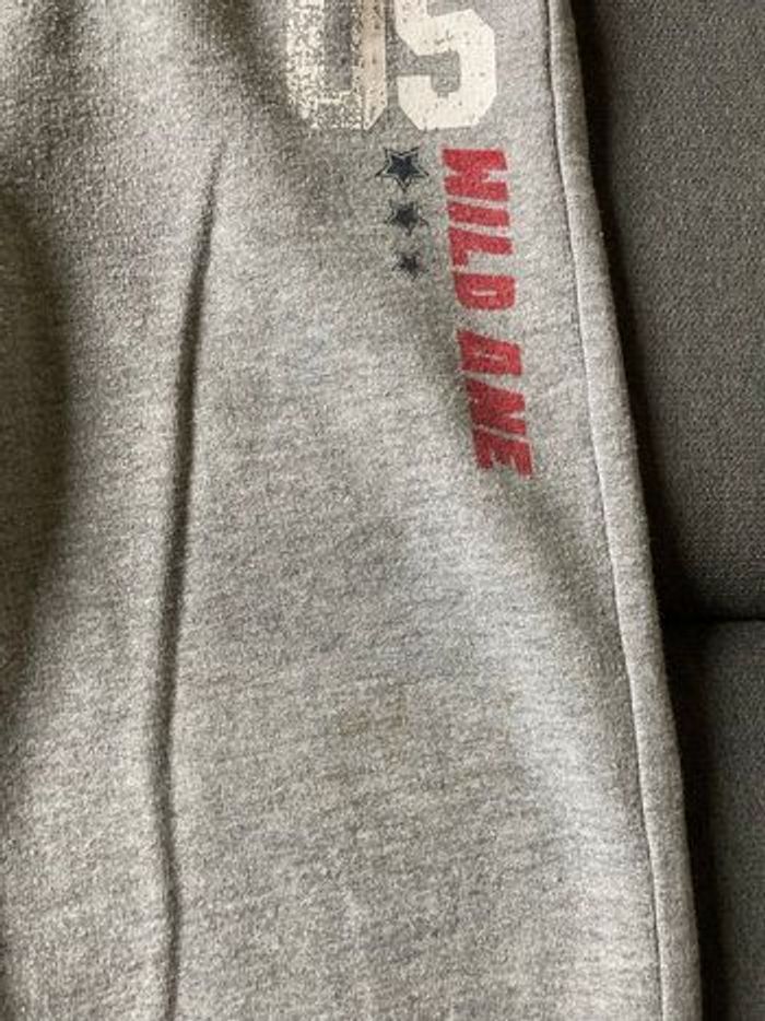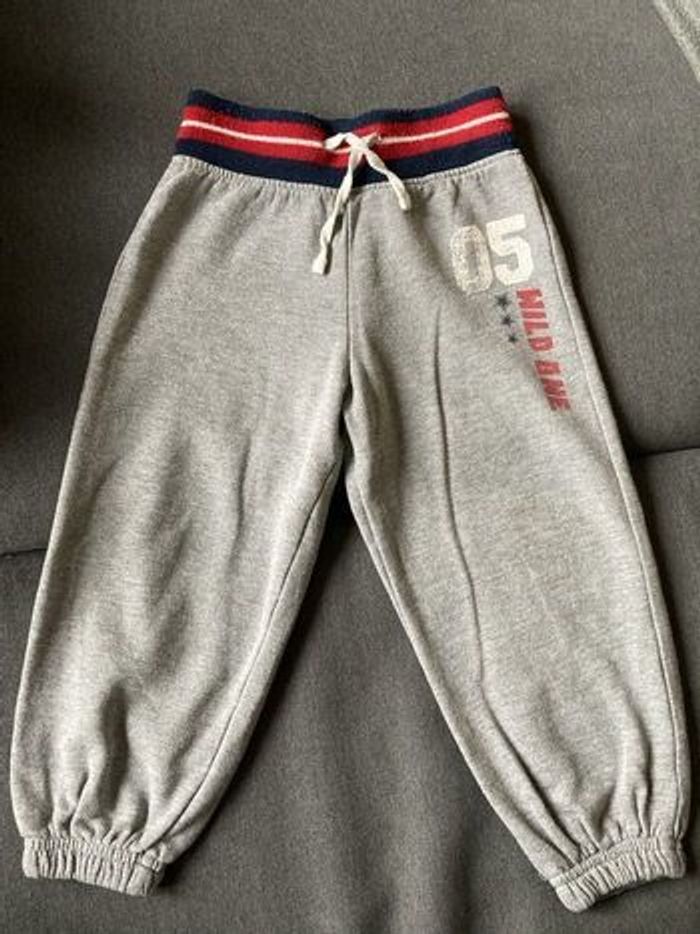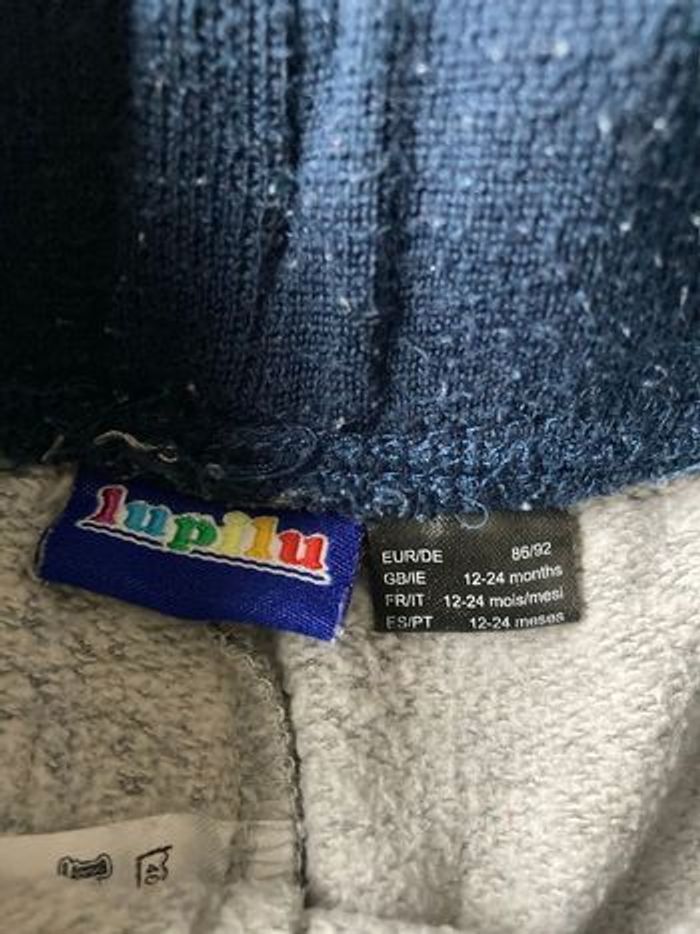 Bas de jogging lupilu 12-24 mois Lupilu taille grand , correspond à un grand 28 mois, petit 24 mois Gris, cordon de serrage, 1 poche arrière Le bandeau de ceinture est bouloché 1 genou taché dans le jardin, cela reste discret D’autres articles 24 mois dans mon dressing