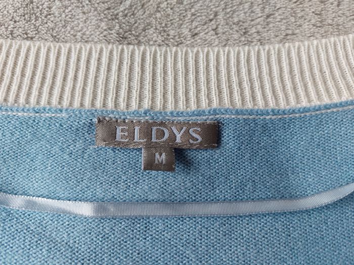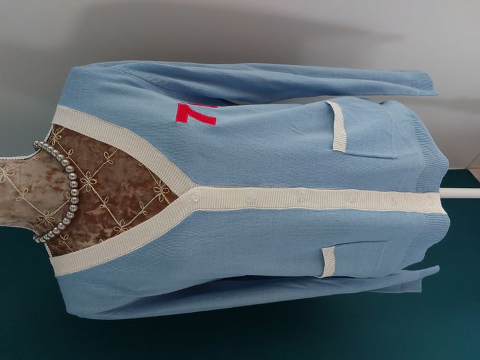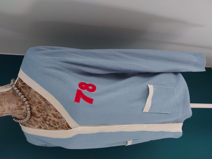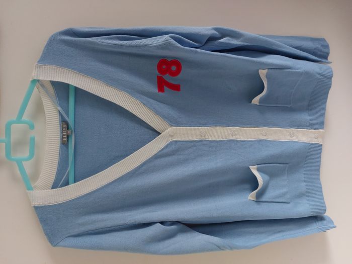 Gilet / cardigan fin de la marque Eldys. Très bon état. Taille M (voir mesures plus bas). Coloris = bleu clairr et blanc. Ecussons 78 sur la poitrine. 2 petites poches. Composition = 100% acrylique. Mesures à plat = Largeur aux épaules = 45cm environ. Largeur aux aisselles = 48cm environ. Longueur = 65,5cm environ. N'hésitez pas à me contacter si vous avez des questions. Je vous répondrai dès que possible.