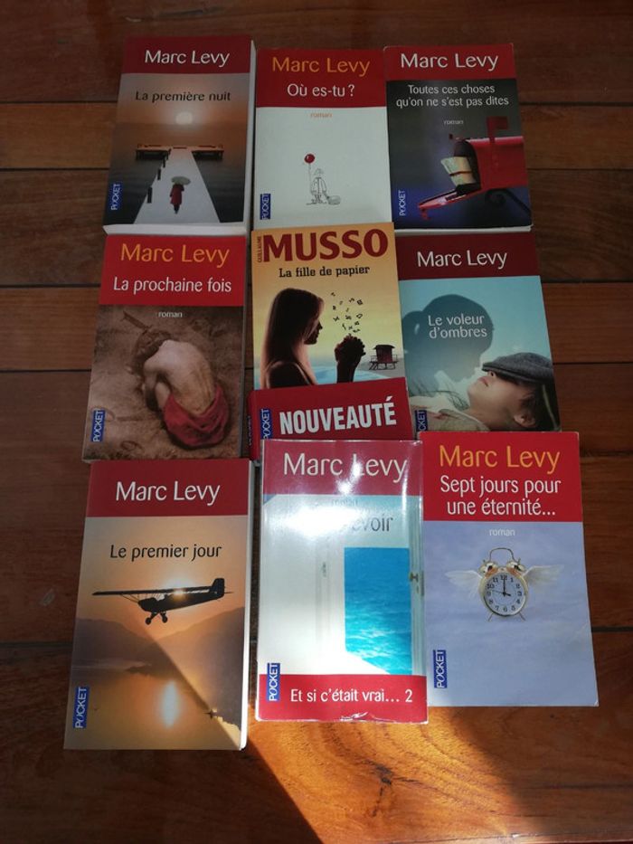 Vends lot de 9 livres Marc Levy en très bon état. Maison non fumeur sans animaux. Les arêtes auront peut être jaunies à certains endroits mais sinon état impeccable.