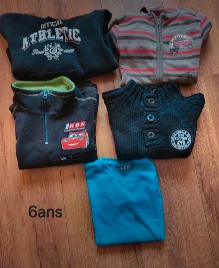 #monocean_taille6ans 4 pulls 1 veste à capuche cars et 1 veste de survêtement airness 6 ans Attention Je mets bon etat car ils ont des bouloches Les vêtements malgre les bouloches restent restent correct . Ils n ont pas de trous. Envoi rapide