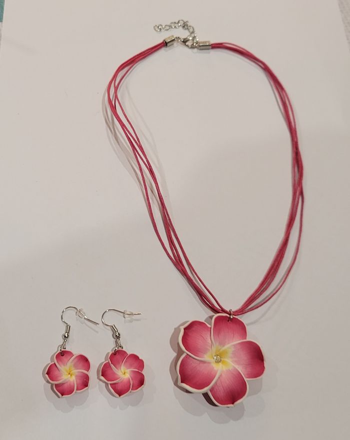 PARURE COLLIER + BOUCLES D'OREILLES FLEUR DE TAHITI ROSE FONCE ! NEUF ! - photo numéro 5