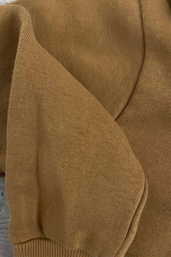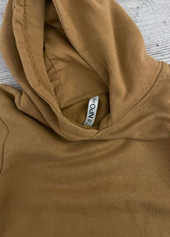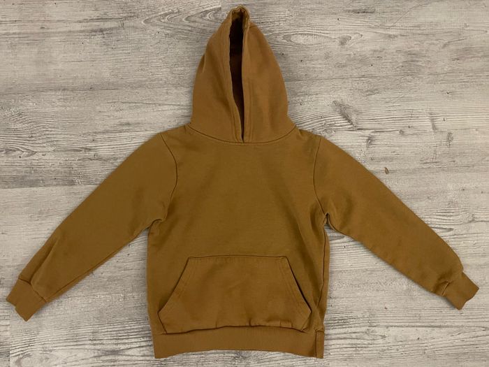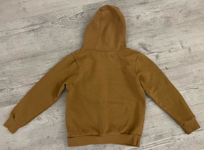 Sweat à capuche de la marque NPO Taille 10 ans Couleur marron clair Présence d’une légère tache verte sur la manche droite (voir photo) Occasion, bon état
