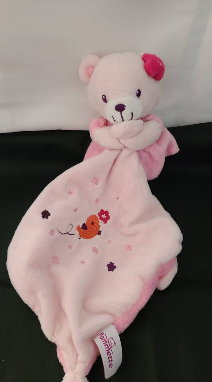 Pommette doudou ours rose mouchoir violet fleur oiseau
