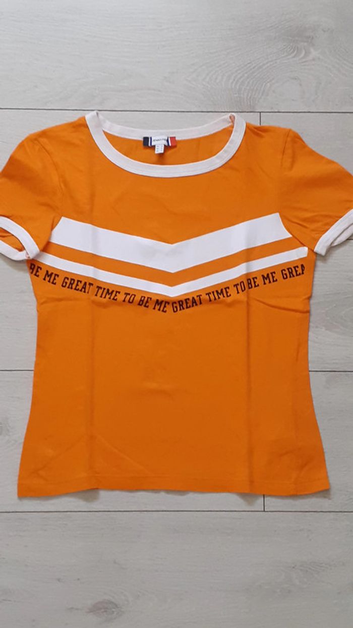 Tshirt à manches courtes taille S marque Jennyfer coloris orange avec écriture noire et bandes blanches #jenni1428_fille_S #jenni1428_vetements_femme