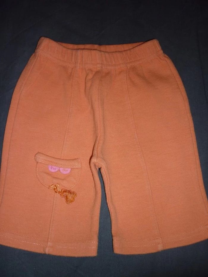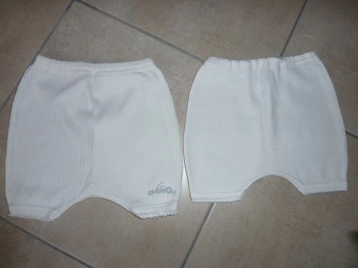 Lot de vêtements pour fille taille 3 mois composé de : 2 culottes shorty blanches (photo 2), 1 jogging orange (photo 5), 2 tshirts à manches longues et 1 à manches courtes (les 3 pressionnés au cou - photo 1), 2 pyjamas sans pied (les 2 à gauche photo 3 / les 2 autres déjà vendus) et 1 pyjama été (en haut à droite photo 4) soit 9 pièces Le tout en très bon état #jenni1428_fille_troismois