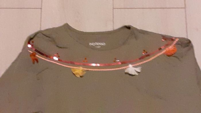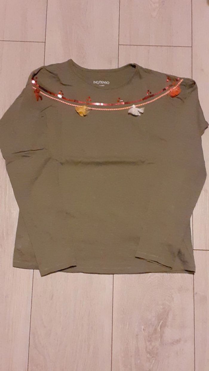 Tshirt à manches longues pour fille taille 14 ans marque In Extenso coloris kaki avec petits pompons et paillettes au col Très peu porté #jenni1428_fille_quatorzeans