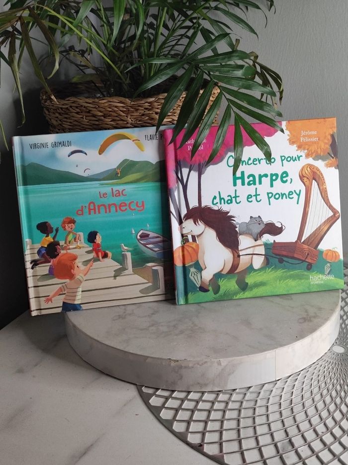 Duo de livres édition hachette jeunesse. - Le lac d'Annecy de virgine grimaldi et flavie pichot. - concerto pour harpe, chat et poney de katherine pancol et jerome pelissier. Livres en très bon état.