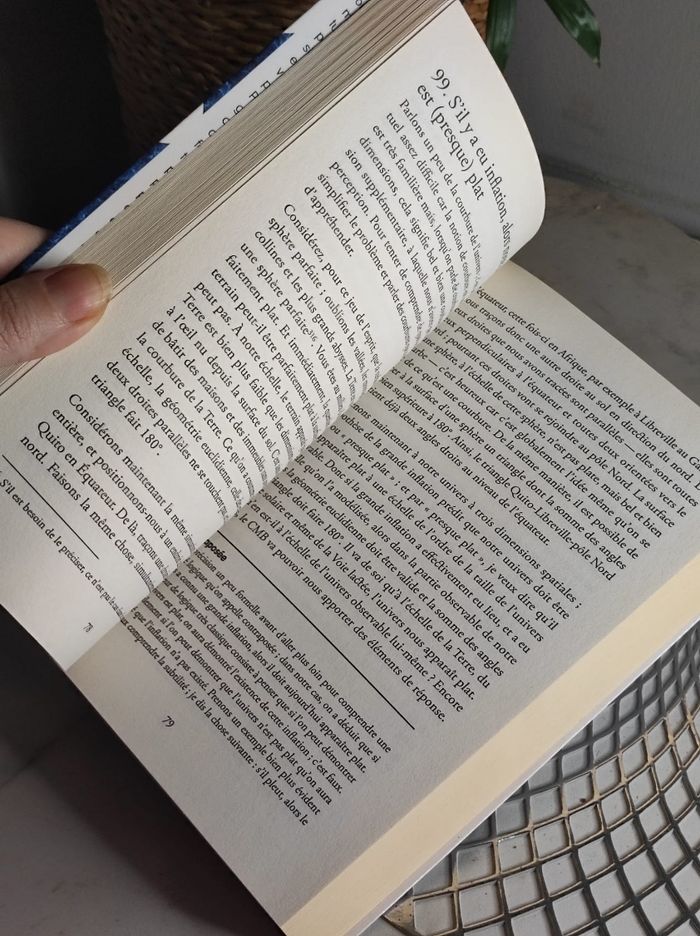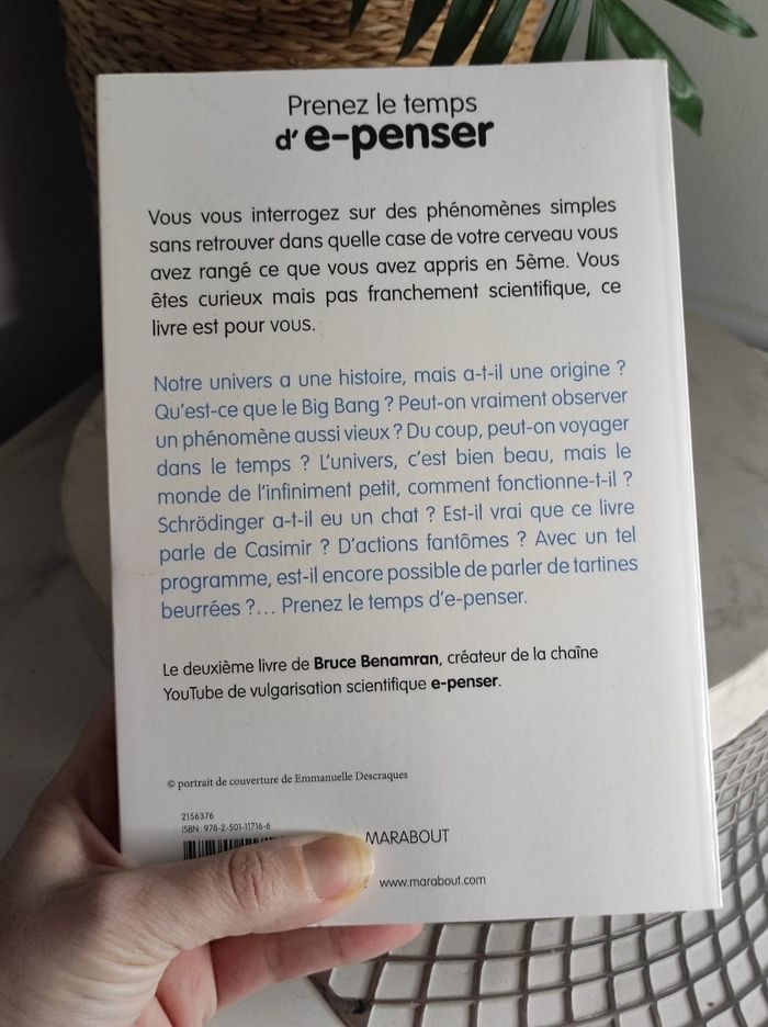 Notre univers a une histoire, mais a-t-il une origine ? Qu’est-ce que le Big Bang ? Peut-on vraiment observer un phénomène aussi vieux ? Du coup, peut-on voyager dans le temps ? L’univers, c’est bien beau, mais le monde de l’infiniment petit, comment fonctionne-t-il ? Schrödinger a-t-il eu un chat ? Est-il vrai que ce livre parle de Casimir ? D’actions fantômes ? Avec un tel programme, est-il encore possible de parler de tartines beurrées ?… Prenez le temps d’e-penser. Léger état d'usure sur la couverture, intérieur intacte, oages jaunis par le temps sur l'extrémité extérieur.
