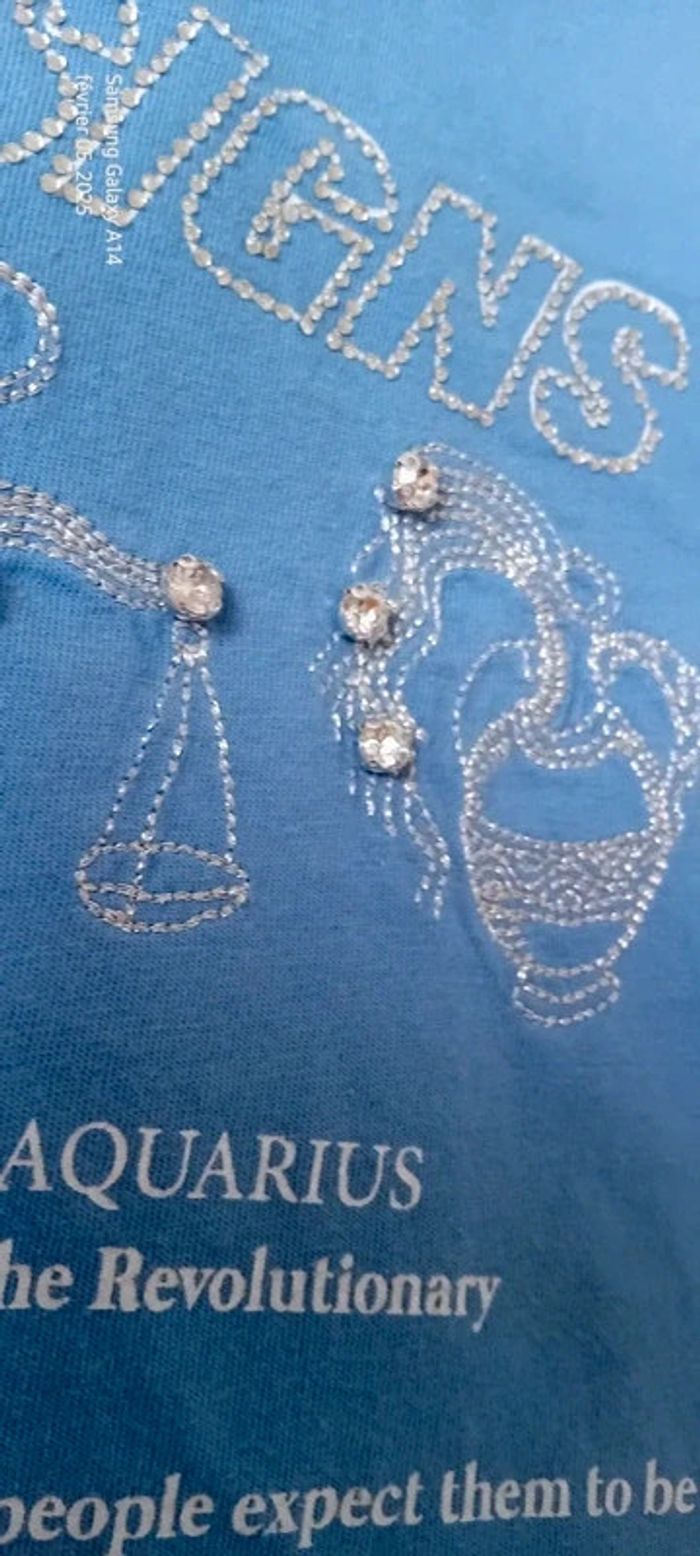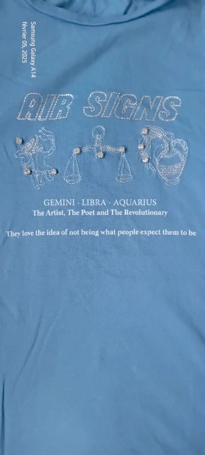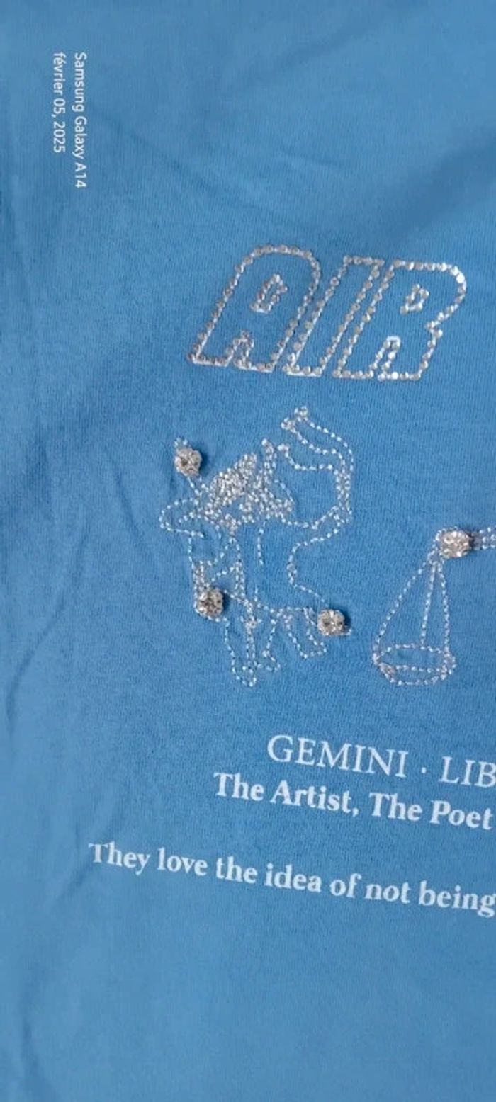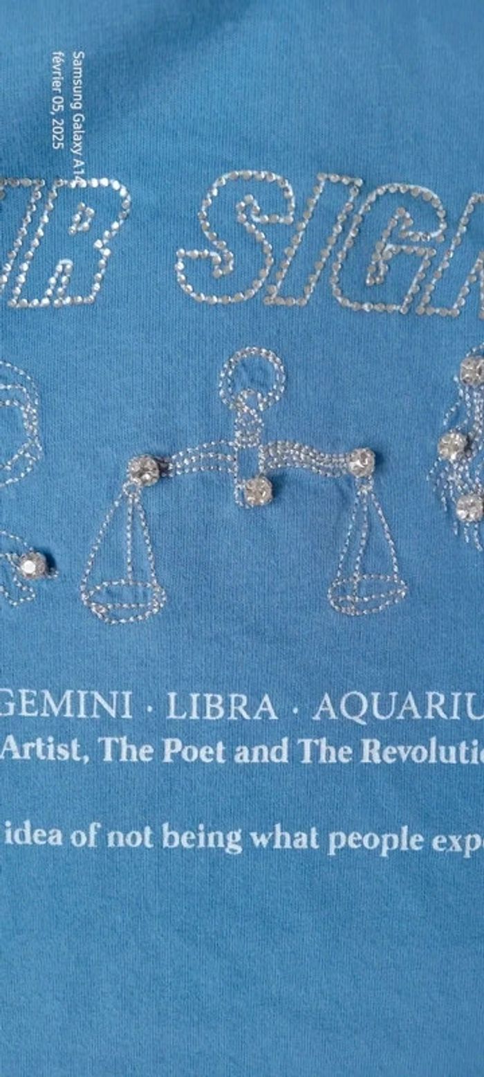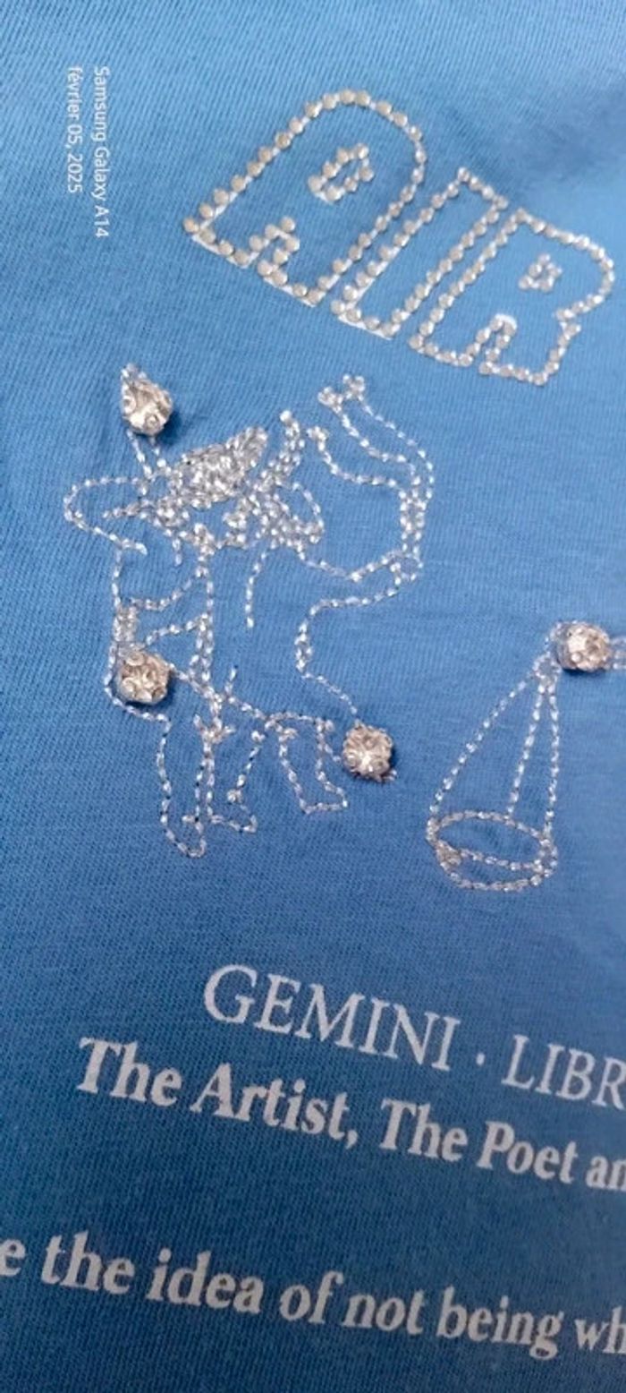 Tee-shirt manches courtes en coton motif signes astrologiques verseau gémeaux et balance avec strass longueur 61 cm largeur aisselles à aisselles 43 cm largeur épaules 35 cm très peu porté en très bon état juste un peu froissé #midole #midolefemme #midolefemme36 #midolefemmeS #teeshirtfemmeS #teeshirtfemme36 #teeshirtstradivarius #stradivarius #signesastrologiques #astrologie #gémeaux #balance #verseau #bleu #strass