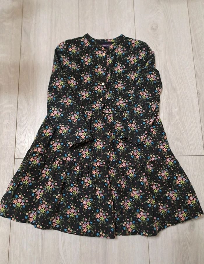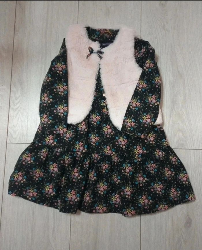 Ensemble chaud 3A. Excellent état "La magie du mercredi" - robe hiver noire imprimé fleuri multicolore. Fils metallises.Bouton de rechange. - gilet sans manche tout doux assorti. Nœud imprimé de la robe.