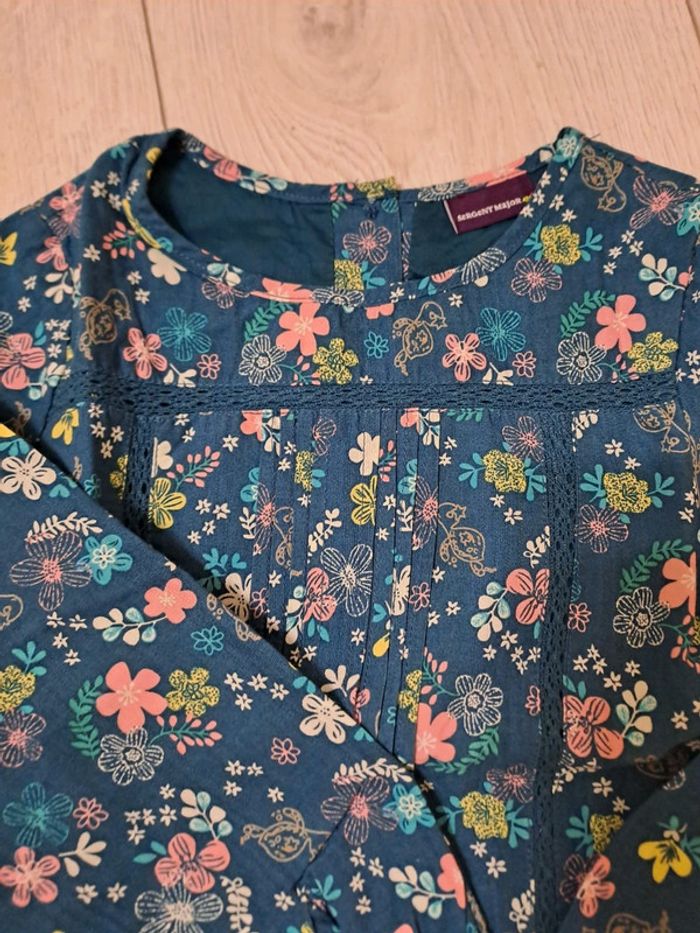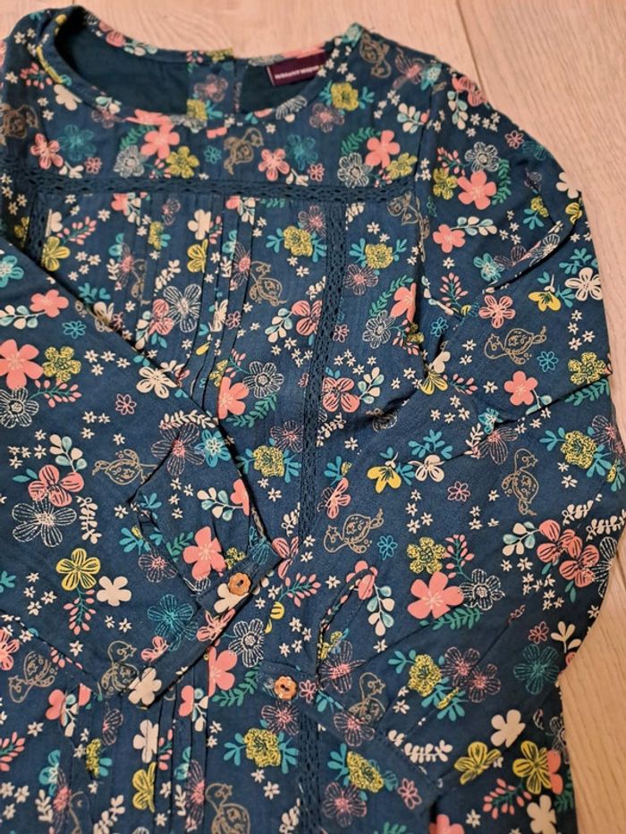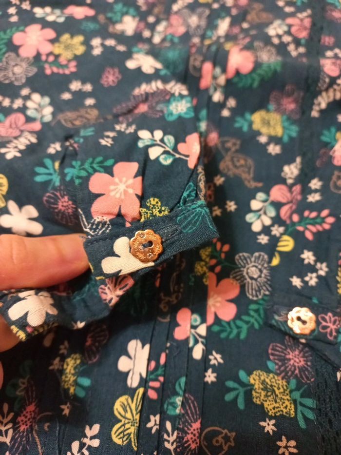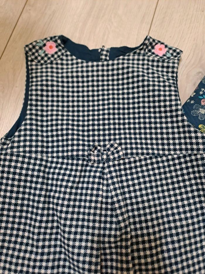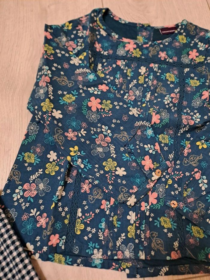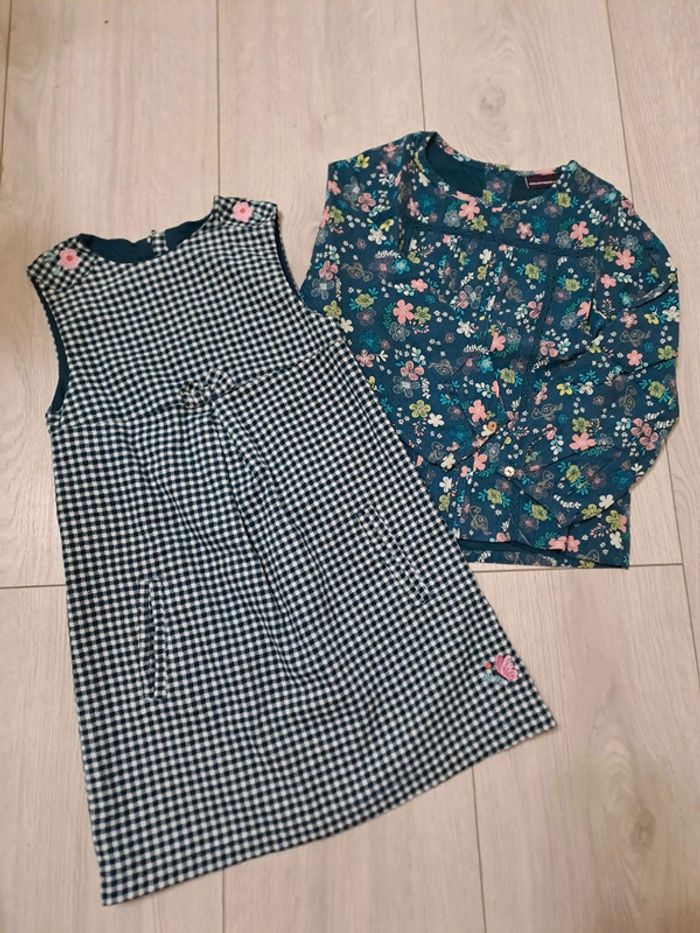 Ensemble 6A etat impeccable Robe à carreaux vert sapin/blanc. Broderies fleuries rose. Petit nœud. Chemisier coordonné vert sapin imprimé fleuri rose/jaune/blanc. Boutons fleurs avec strass