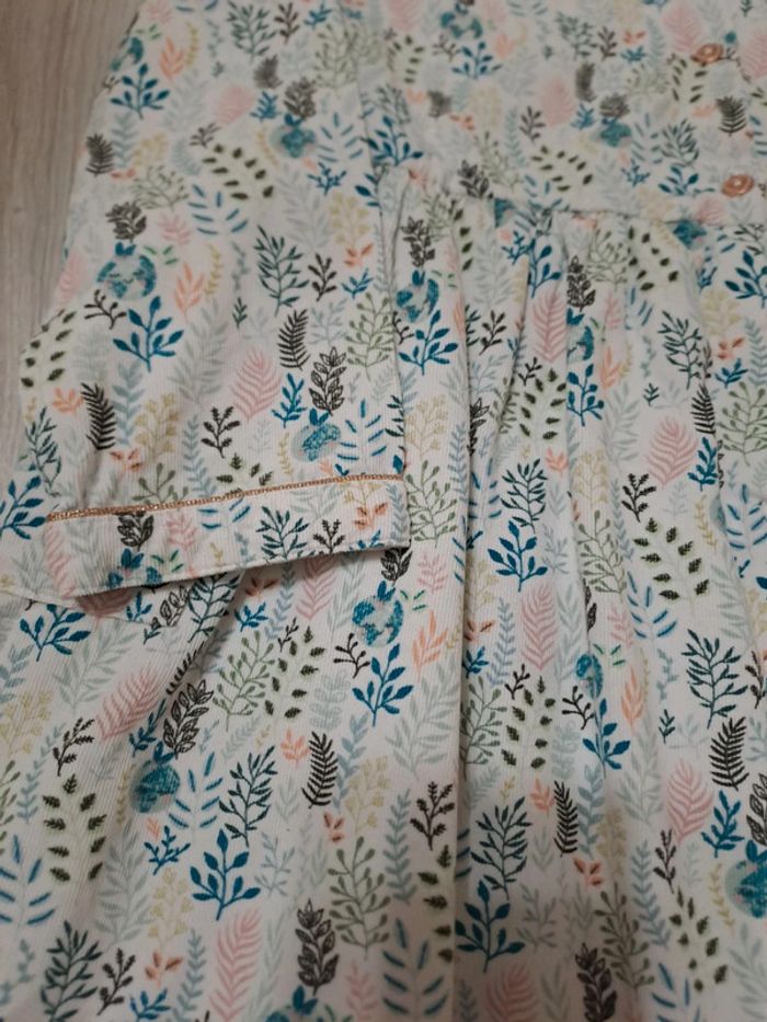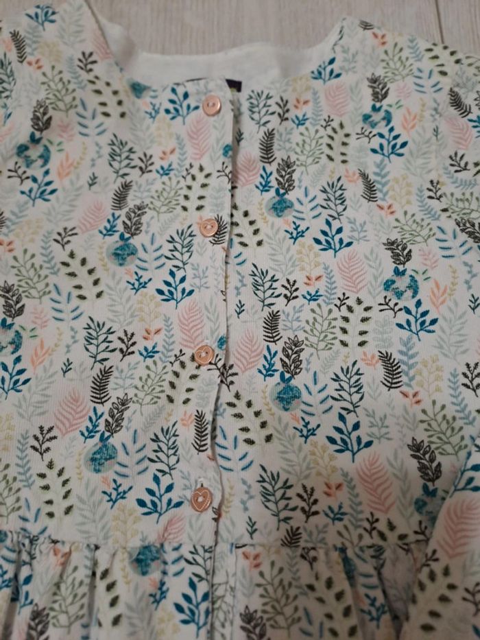 Robe velours 6A. Excellent etat Couleurs douces: turquoise/rose/kaki Liserets dorés pailletés. Boutons motif cœur. Superbe!