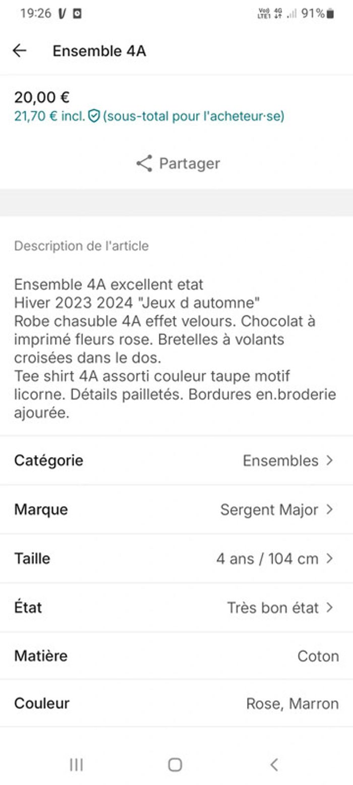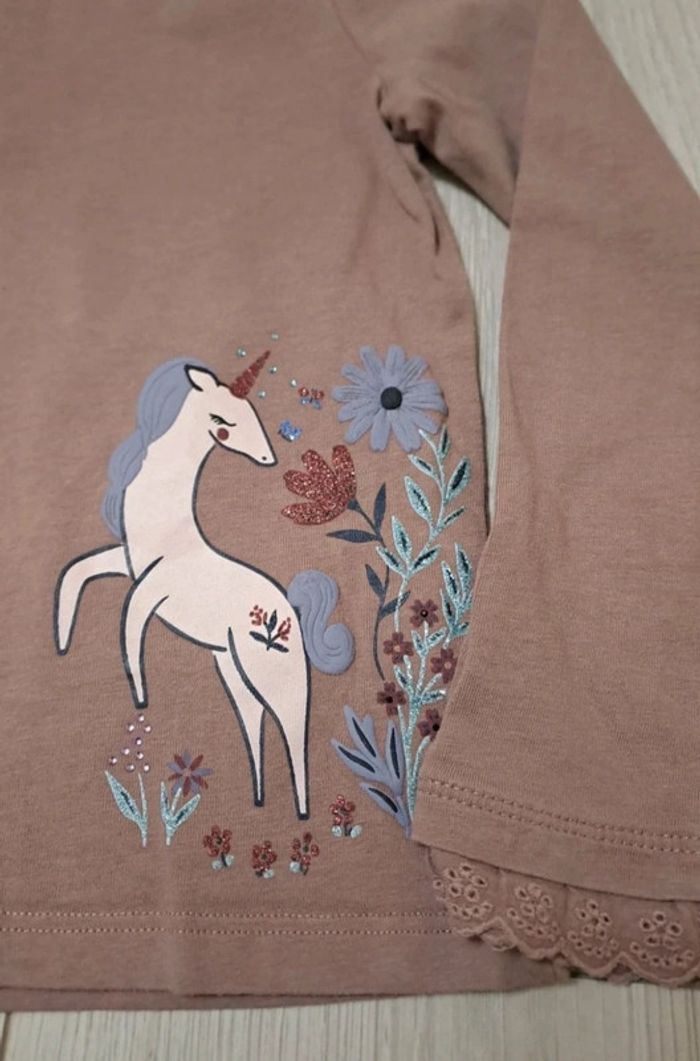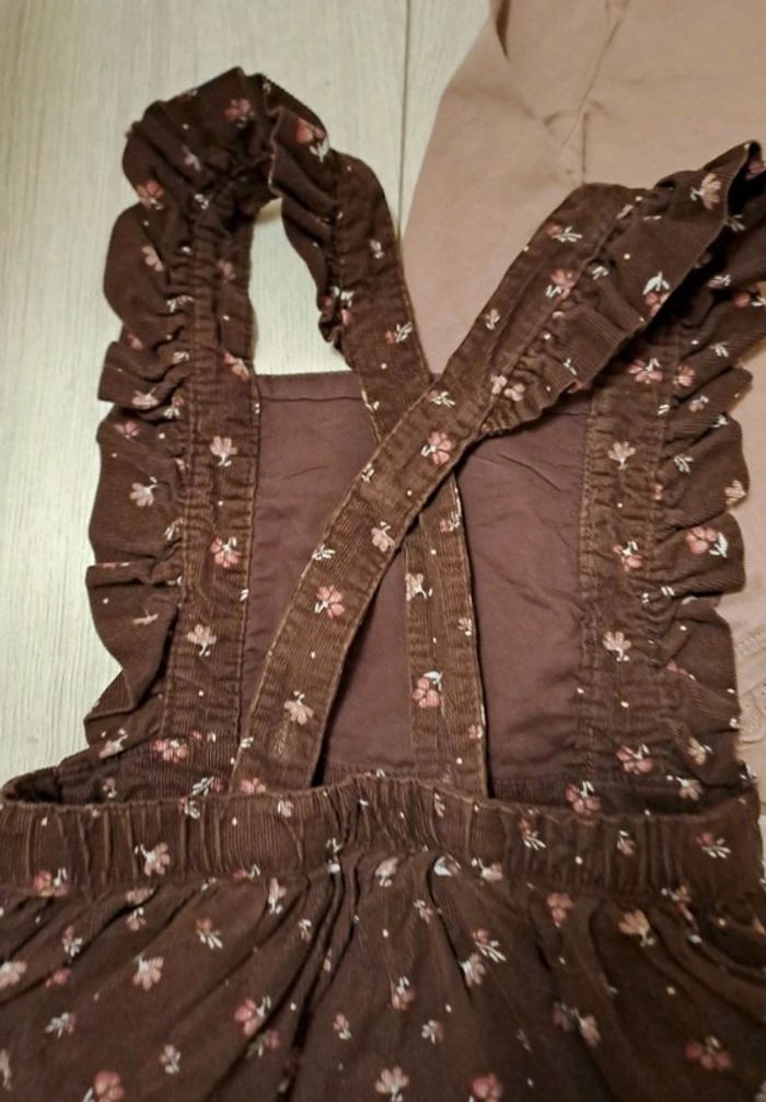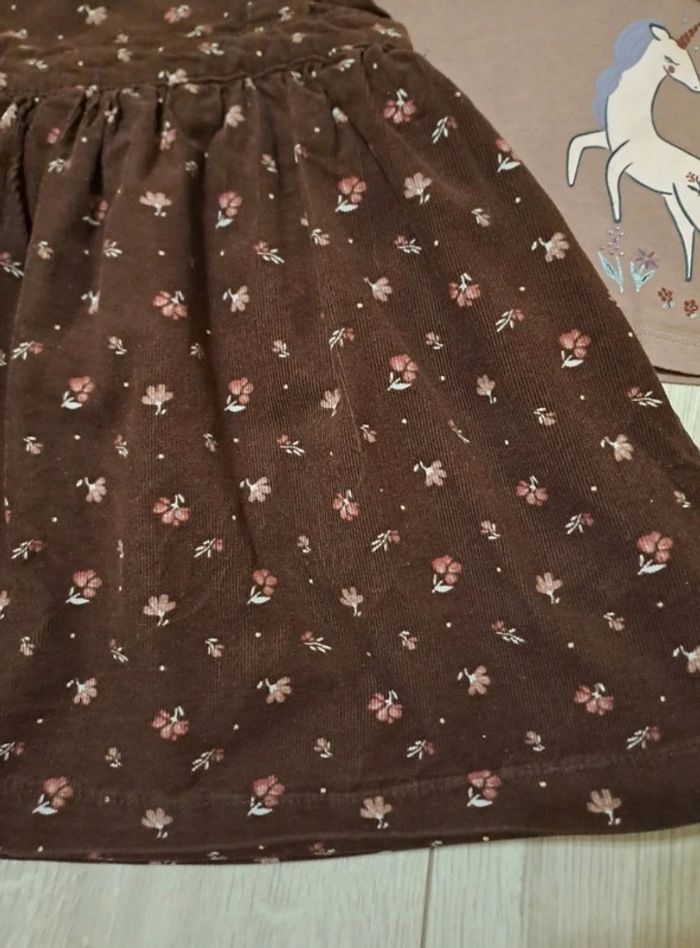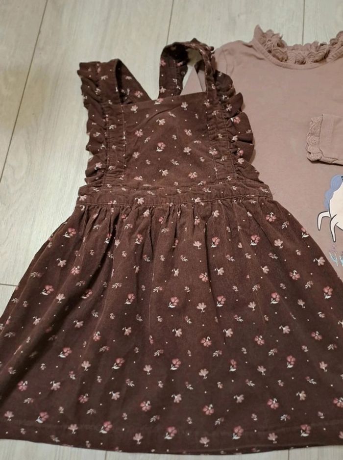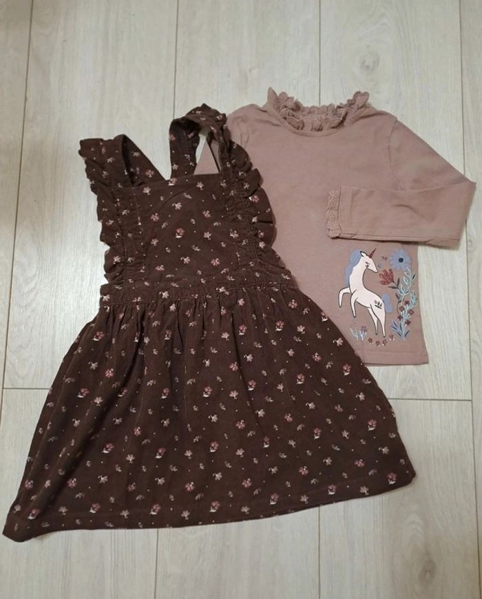 Ensemble 2/3A excellent etat Hiver 2023-2024 "Jeux d automne" Robe chasuble velours chocolat imprimé fleurs rose. Bretelles à volants croisées dans le dos. Tee shirt assorti taupe. Motif licorne. Détails pailletés. Broderies ajourées en bordure