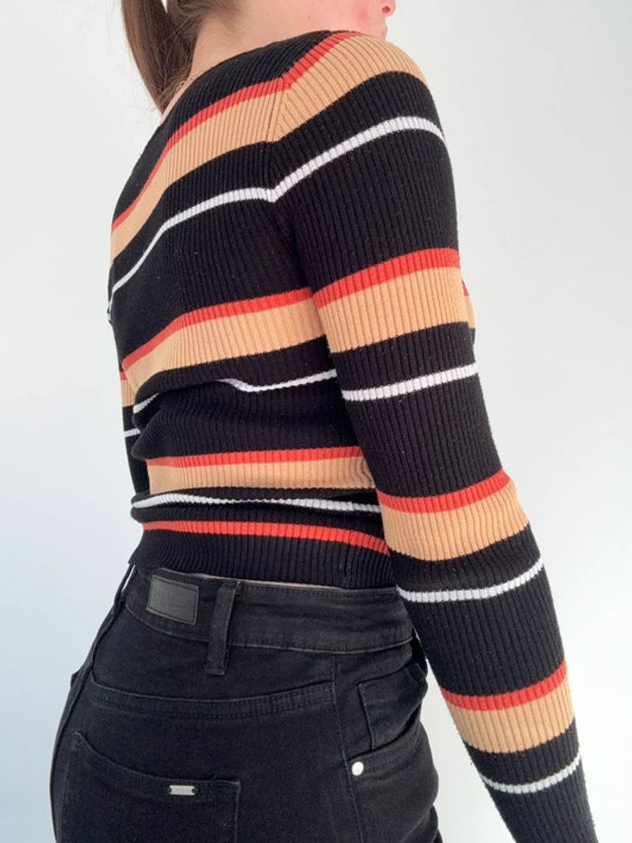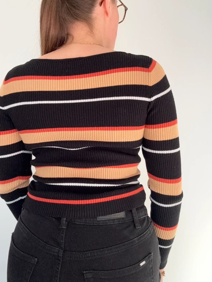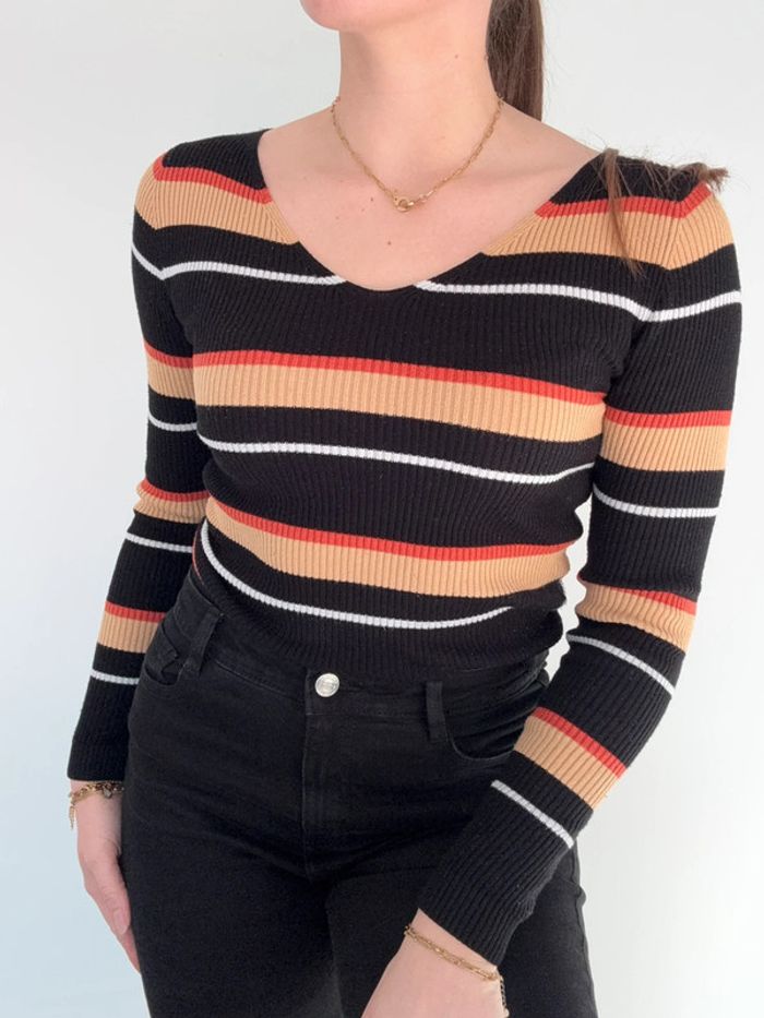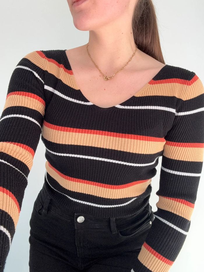 Haut noir avec rayures beiges et corail Très confort Col V Quelques micro bouloches mais ça se voit que de près