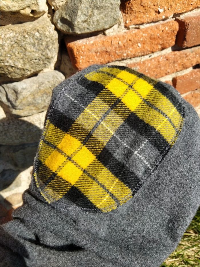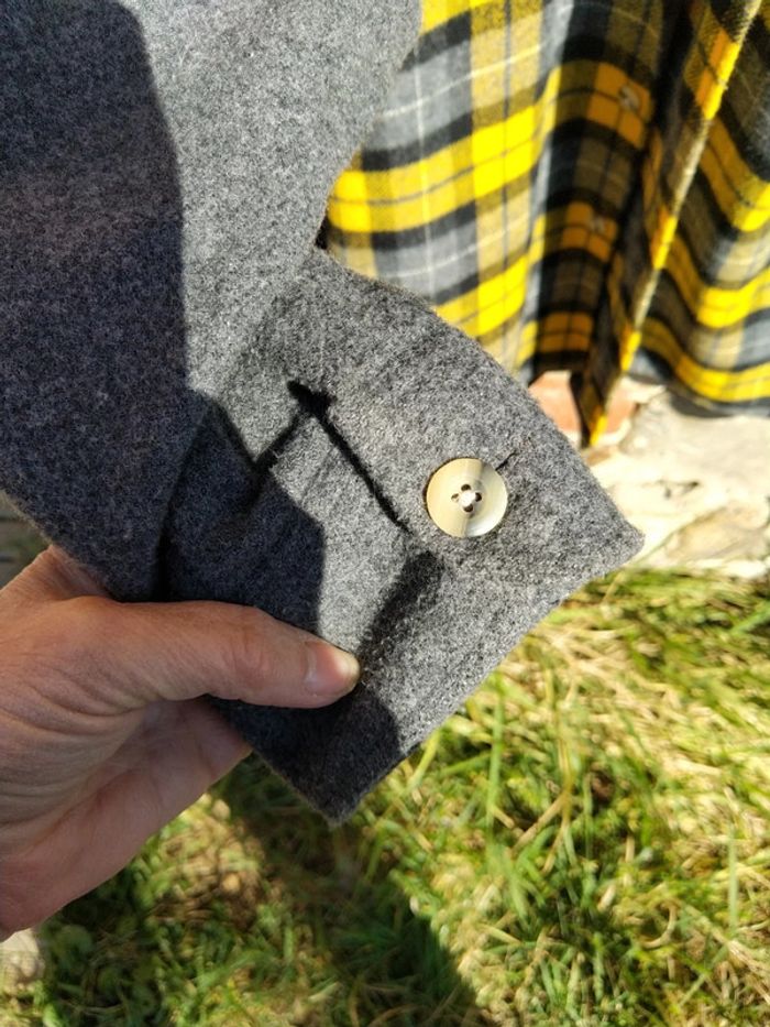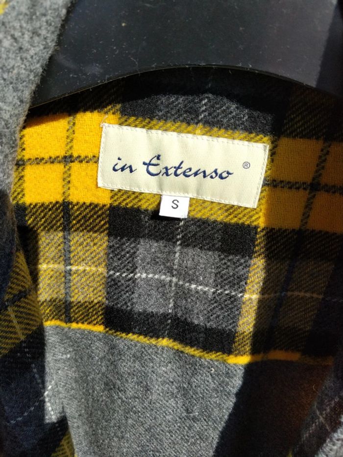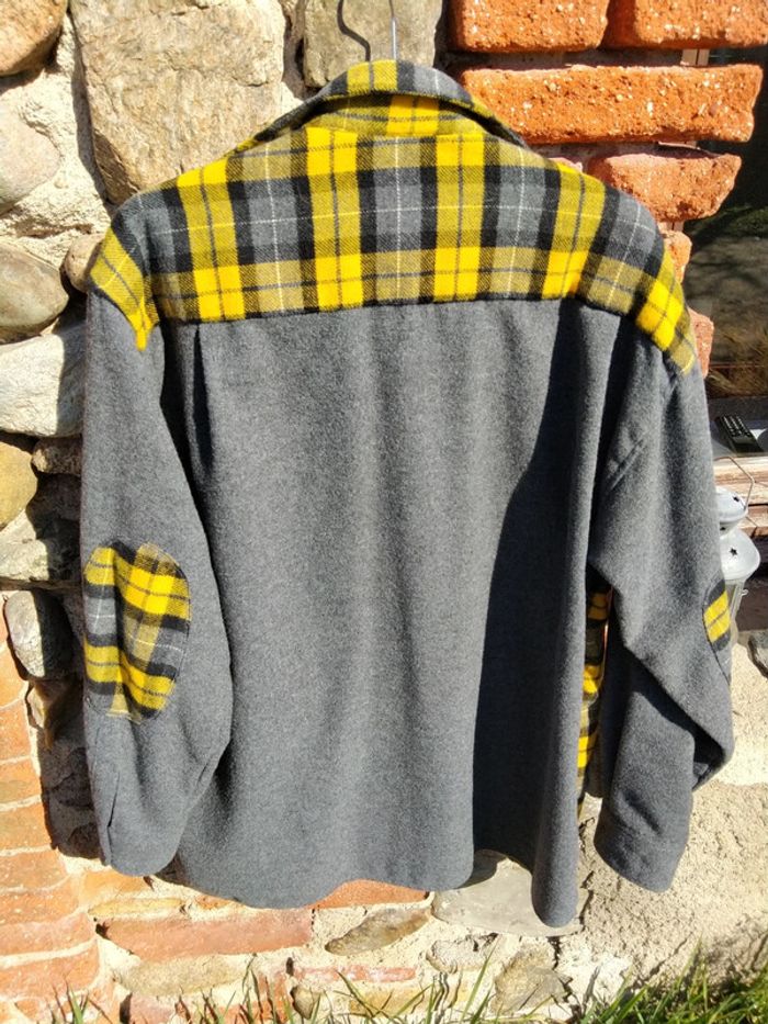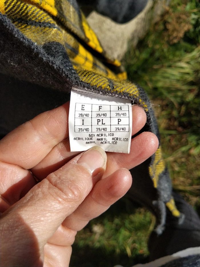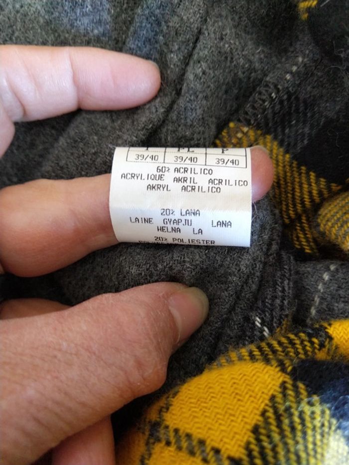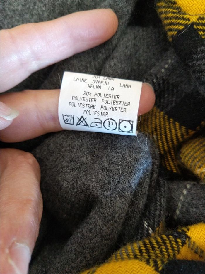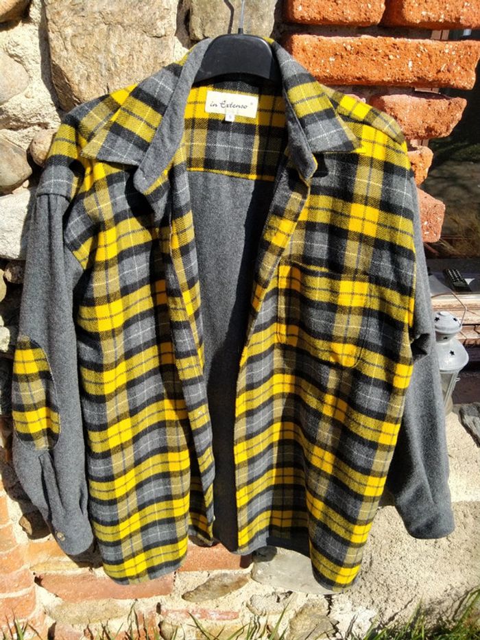 Chemise ou sur chemise assez chaude à carreaux jaune gris noir en laine acrylique et polyester taille S 39/40. Les manches sont grises. Au niveau du coude il y a un rappel du tissu à carreaux Je l'ai bien portée.