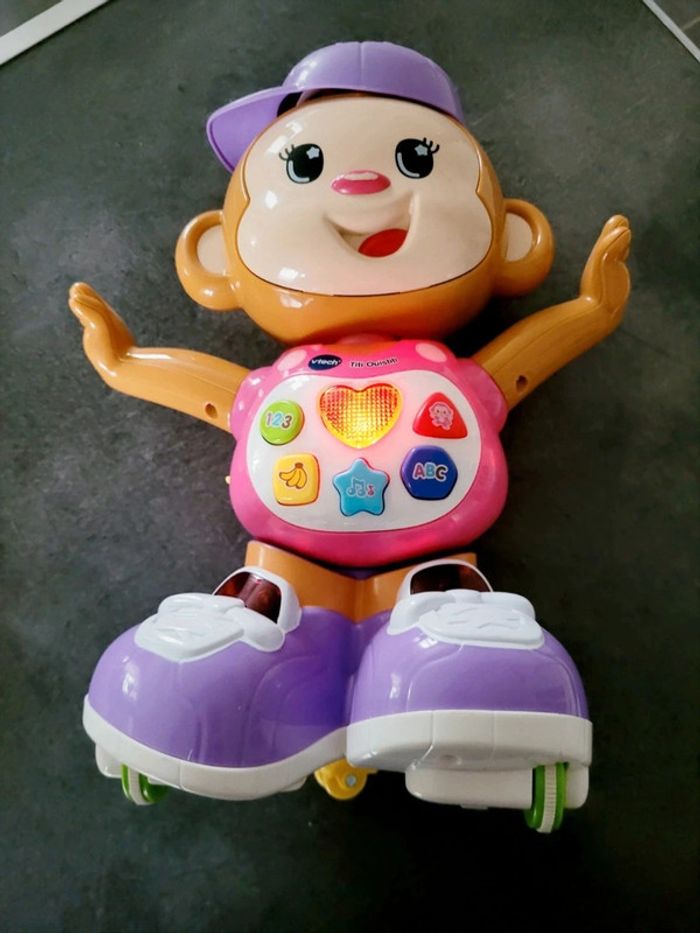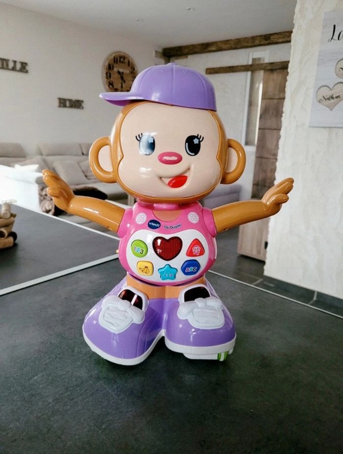 Valeur neuf 54€ Très peu servi 12-36 mois - en Français VTech titi ouistiti singe interactif Ce singe interactif amuse votre bébé en tournant sur lui-même et en avançant automatiquement, incitant ainsi bébé à le suivre. Véritable développeur de motricité et de langage pour bébé, Titi Ouistiti danse au rythme des mélodies et invite l’enfant à chanter avec lui Des détecteurs de mouvement sont installés à l’avant et à l’arrière de Titi Ouistiti, un singe interactif et intelligent, pour qu’il contourne les obstacles. 6 touches lumineuses sont présentes sur le corps de Titi Ouistiti, ce qui permettra à bébé d’apprendre les premiers chiffres, les premières couleurs et mélodies 2 modes de jeu : découvertes et jeux. Dans le mode découverte, Titi Ouistiti est en mouvement et incite bébé à le suivre. Dans le mode jeux, le singe s’amuse, chante et danse au rythme de la musique.