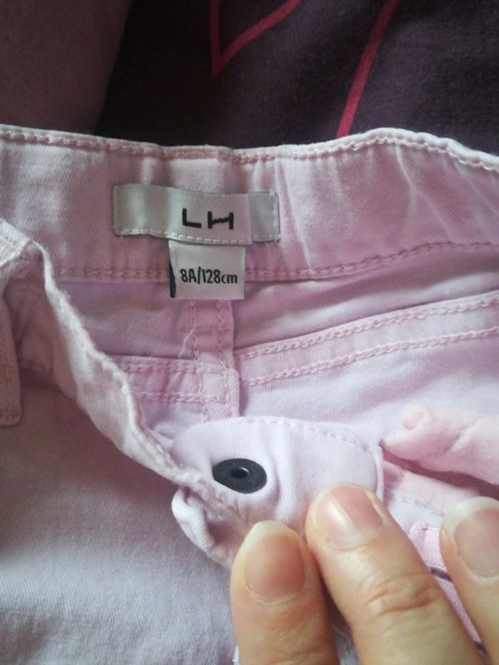 Jamais porté erreur de taille Bouton pression fermeture éclair et taille ajustable plus possibilité de mettre une ceinture Jolis petits détails coeur Taille 8 ans