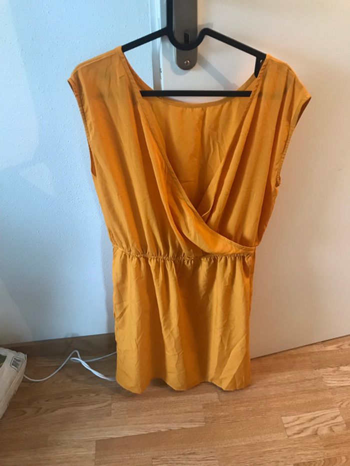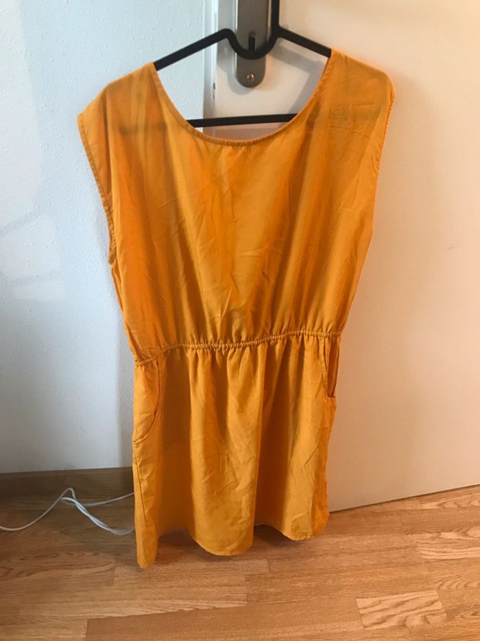 très belle robe jaune moutarde . offerte après accouchement . trop petite . jamais mise . taille 42 mais correspond à un 40 .
