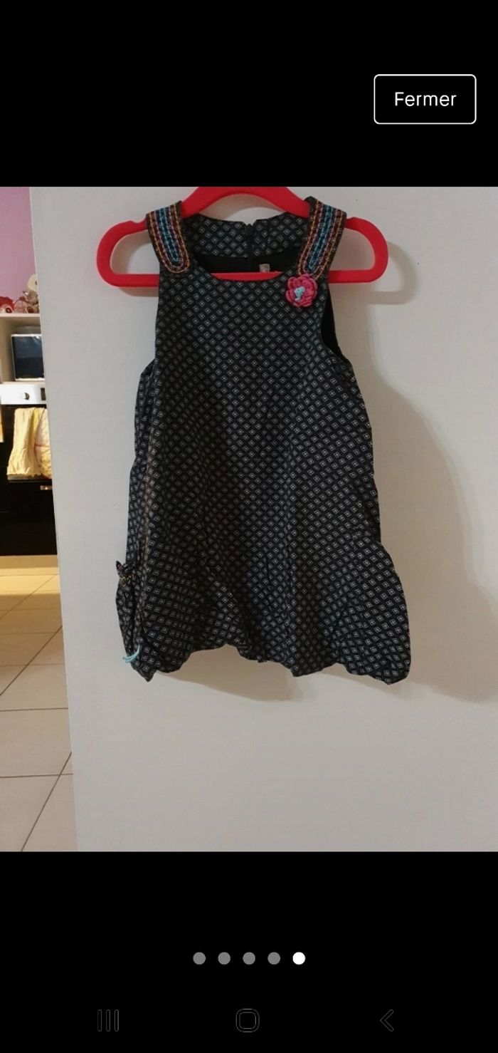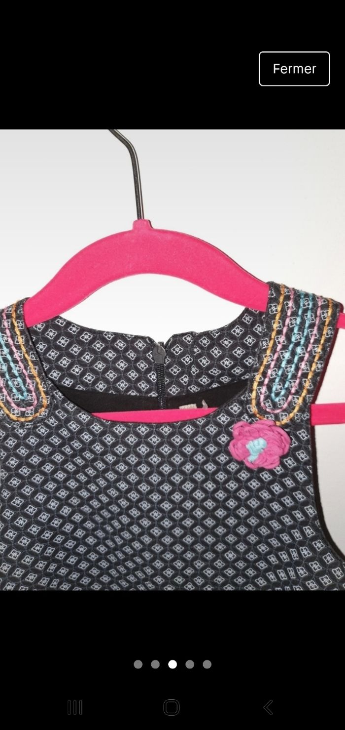 Robe noir a bretelles avec liserets colorés avec poche de chaque côté. Petites fleurs blanches sur l intégralité de la robe. Orchestra. 2 ans 92 cm.